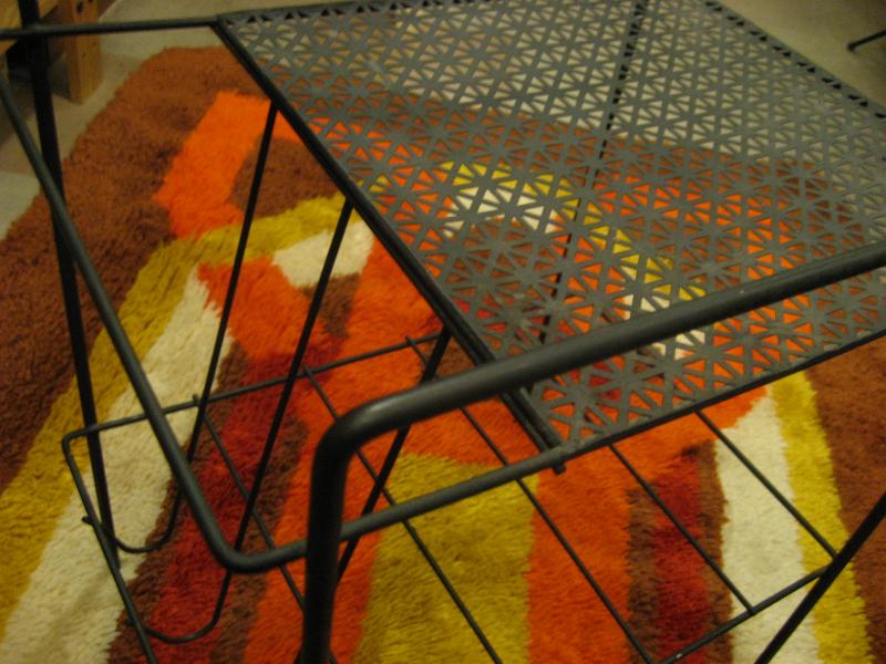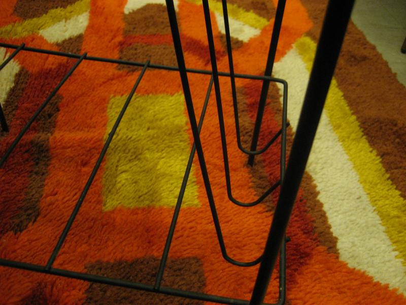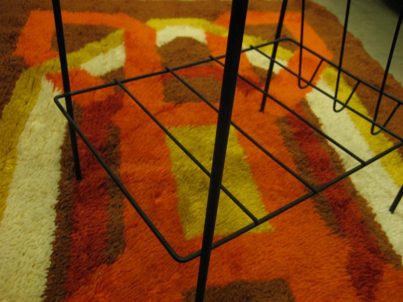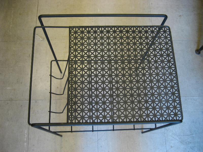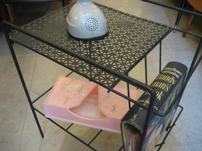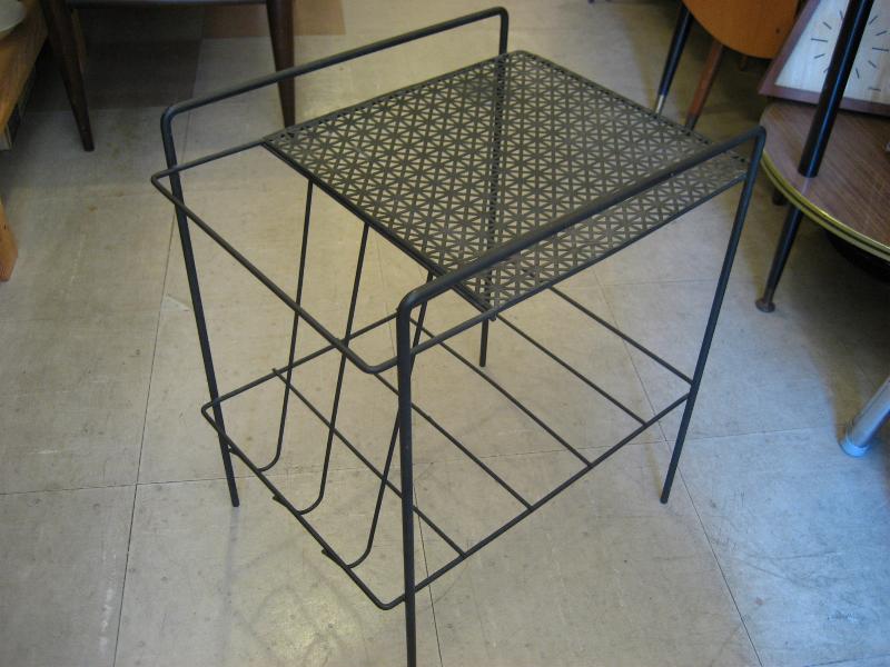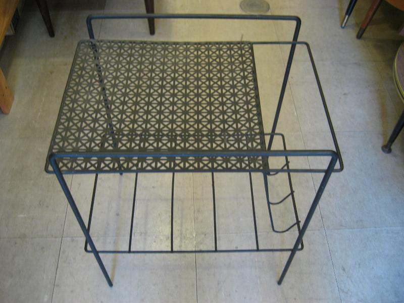 | ビンテージアトミックアイアンシェルフ / 50年代 USA. マガジンラックの付いたブラックアイアンメイドのビンテージシェルフ。アイアンフレームにトップはメッシュシェルフ。アンダーはワイヤーシェルフで、マガジンストックあり。ソファサイドやウォールサイド、お部屋のコーナーなどさまざまな用途に。。。幅広いディスプレイが楽しめるクールでGOODなビンテージフロアピース! |