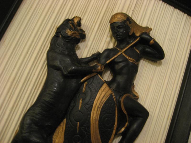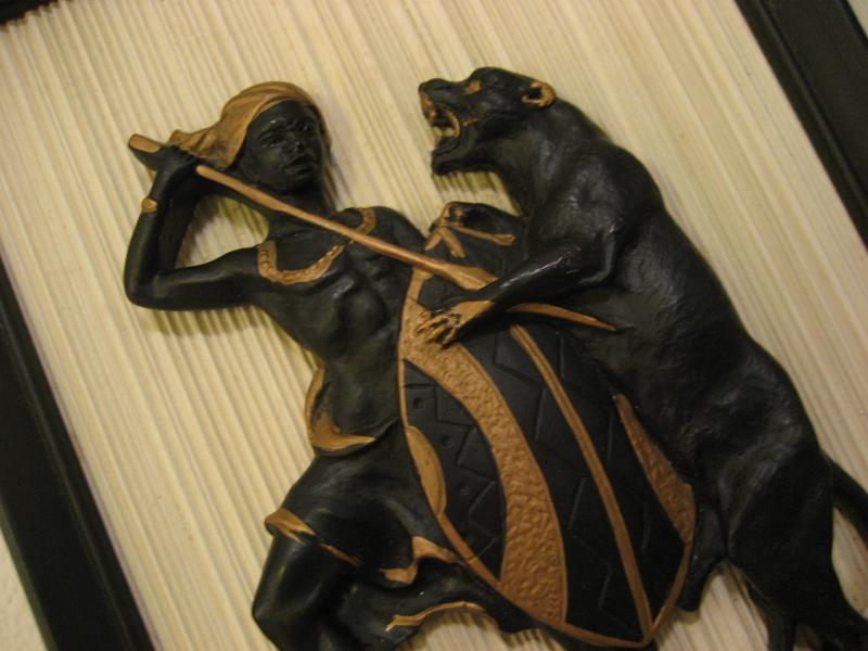 USA. アフリカンウォーリアーとブラックパンサーのファイティングシーンの壁掛け。フレームはウッドメイド、アフリカンとパンサーはチョークメイドでブラックにゴールドアクセントカラー。クールでGOODなビンテージウォールデコレーションピース! |