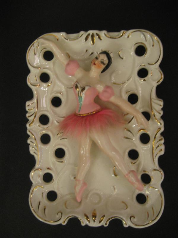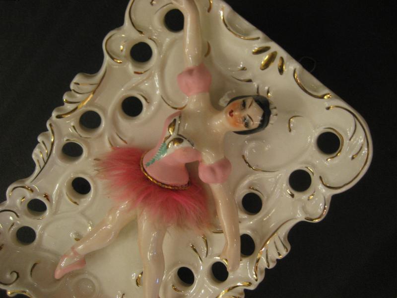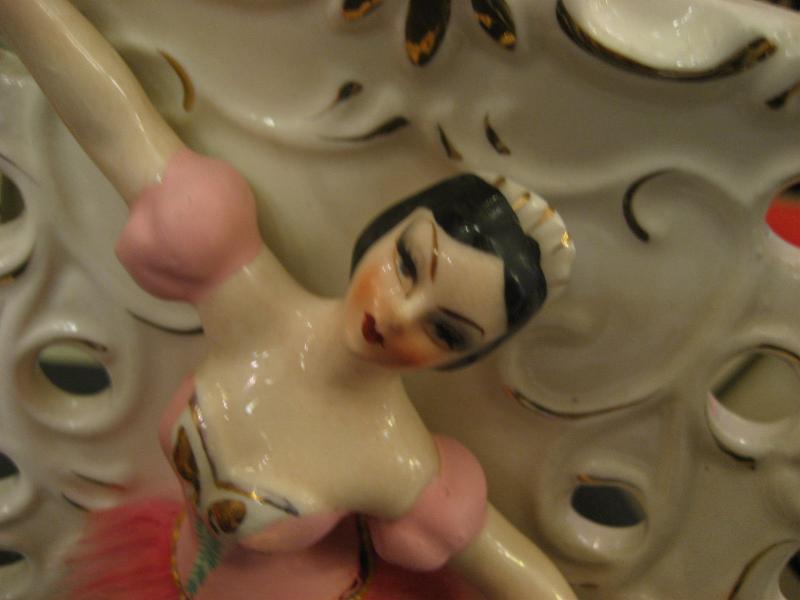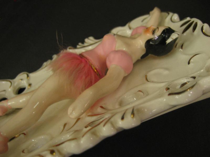 | ビンテージウォールデコプランター / 40-50年代 USA 陶器製のバレリーナデコの壁掛けプランターベース。置物にもなり、同じシリーズでデビルタイプもあるレアな1点。ウエストはデビルレディと同じファーデコレーション。クールでGOODなビンテージデコピース! |