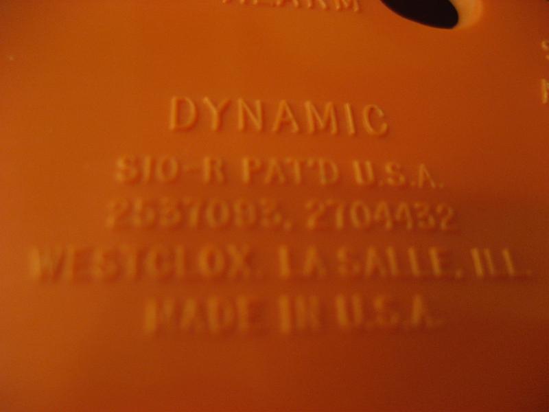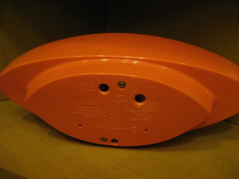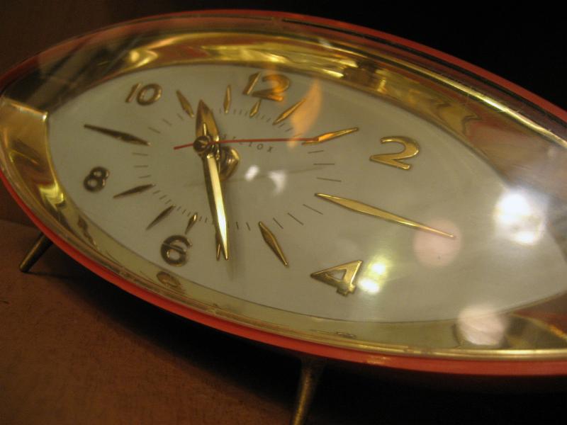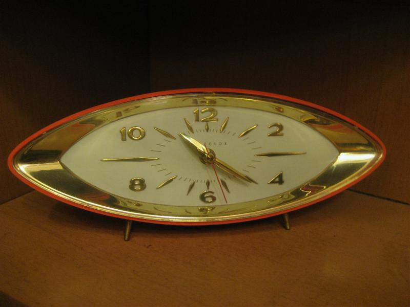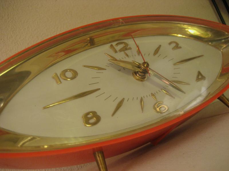 IN USA. ウェストクロックス "DYNAMIC" という名のクールな置時計。50年代独特のEYEシェイプ。ボディカラーはオレンジで文字盤はゴールドフレームにオフホワイト。ゴールドインデックスダイアルで偶数表記、ゴールドハンドに秒針はレッド。クールでGOODなビンテージタイムピース! ムーブメントはバッテリータイプ(単3x1個使用)に交換済みでですので時間は正確です。 |
