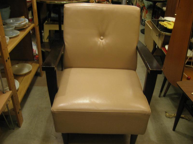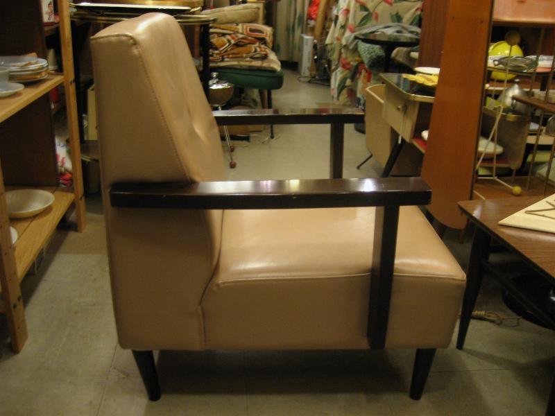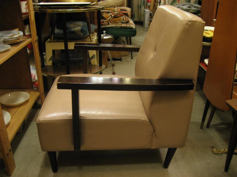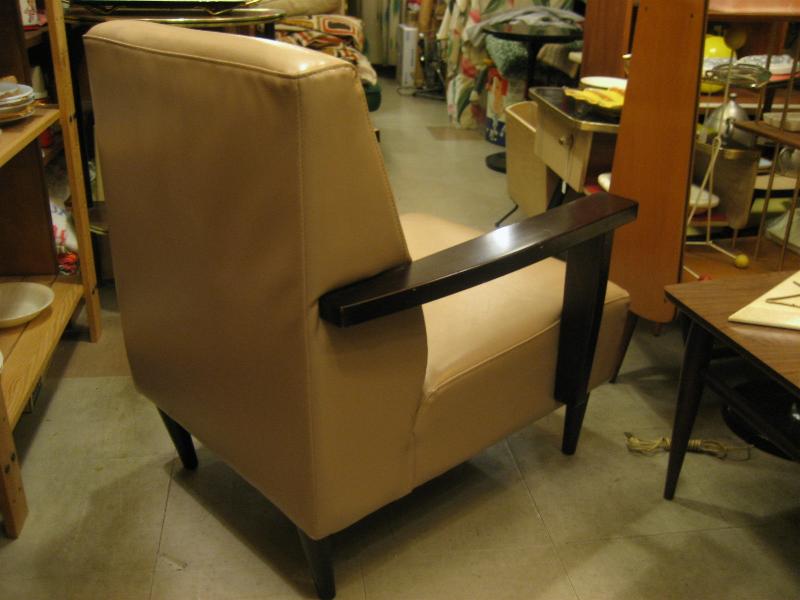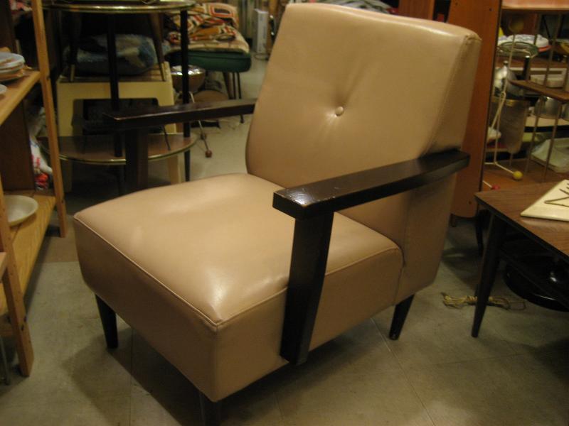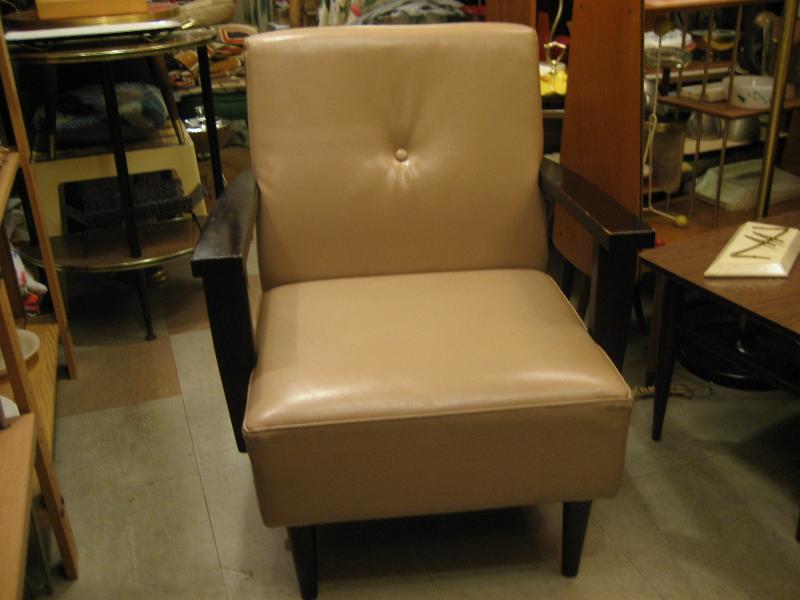 | ビンテージソファ / 70年代 USA 一人掛けタイプのビンテージソファ(ラウンジチェア)。ベージュカラーの合わせやすい色合いのビニルレザータイプシートファブリックにダークブラウンカラーのウッドアームと4本レッグタイプのシンプルモダンな一品。クールでGOODなビンテージフロアピース! |