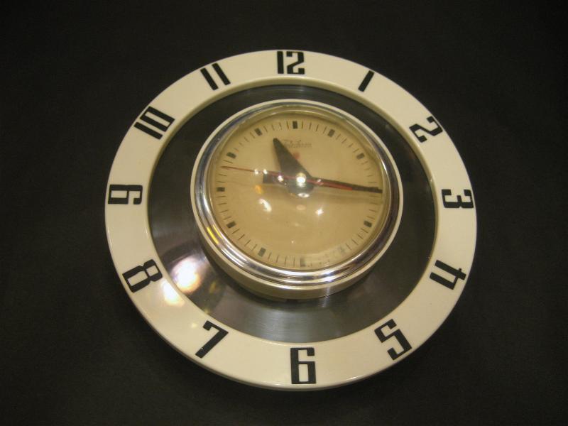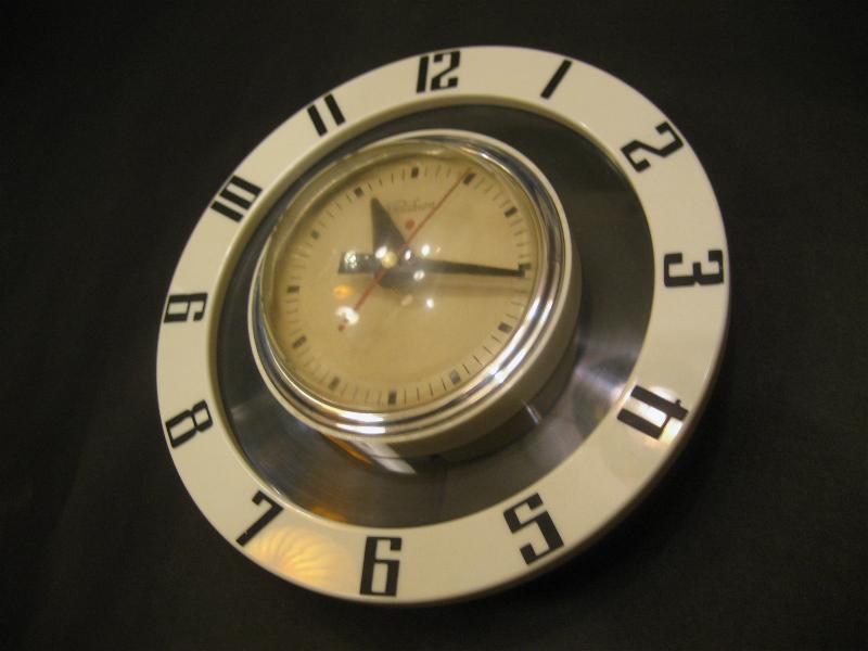 IN USA. GE社の"Telechron"ブランド。UFOシェイプでスペーシーフォルムのアトミックな壁掛け時計。ドームタイプのクールなフロントカバーにホワイト文字盤、ブラックインデックス&ハンド(秒針はレッド)。クールでGOODなビンテージタイムピース! ムーブメントはバッテリータイプ(単3x1個使用)に交換済みでですので時間は正確です。 |