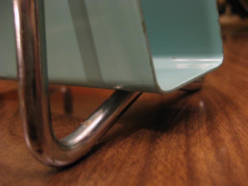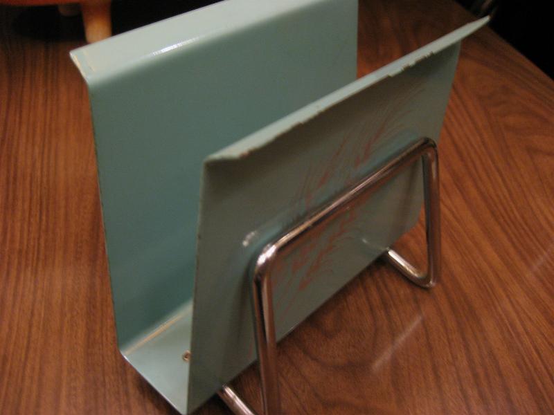 | ビンテージホルダー / 50-60年代 USA. クロームメイドのヘアピンレッグフレームにミントグリーンのメタルホルダーのビンテージペーパーストッカー。テーブルトップのナプキンホルダーとしてはもちろん、ポストカードや封書などのストックにもおススメ。クールでGOODなビンテージピース! |