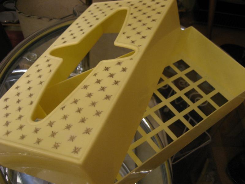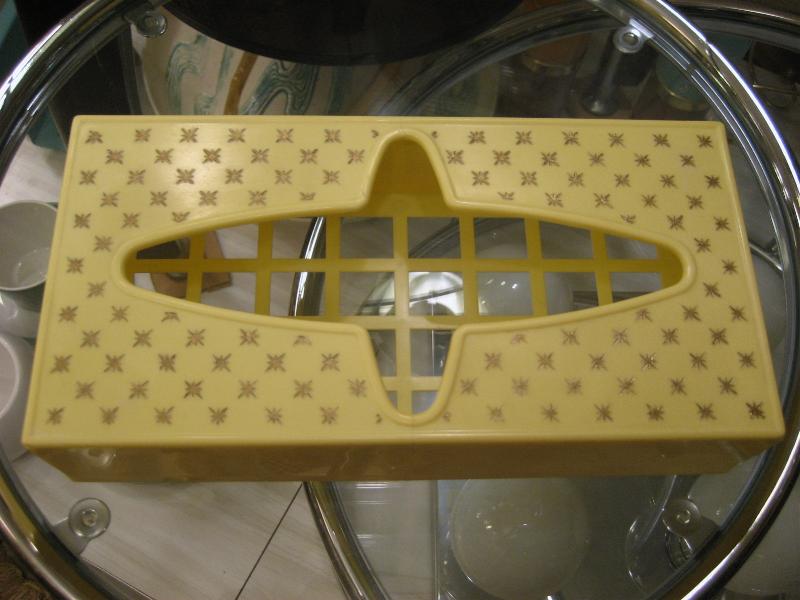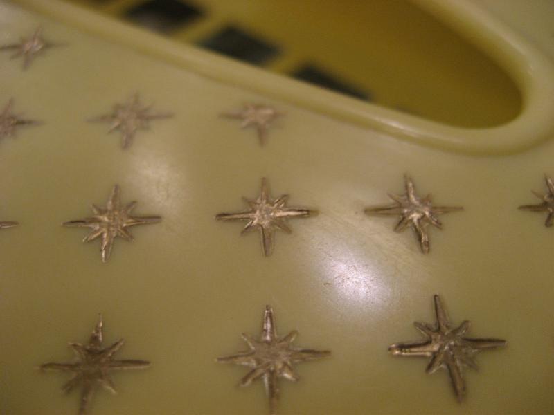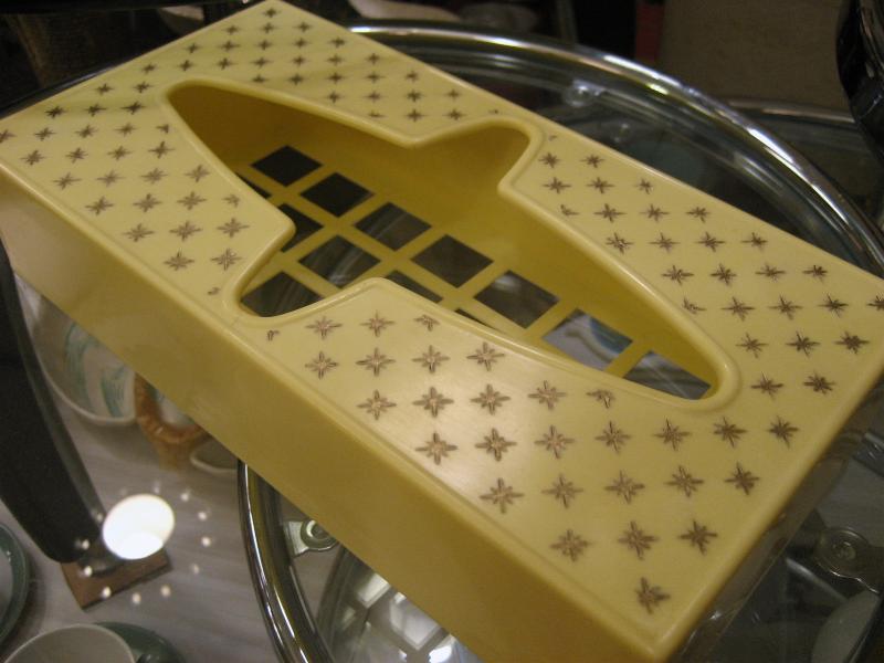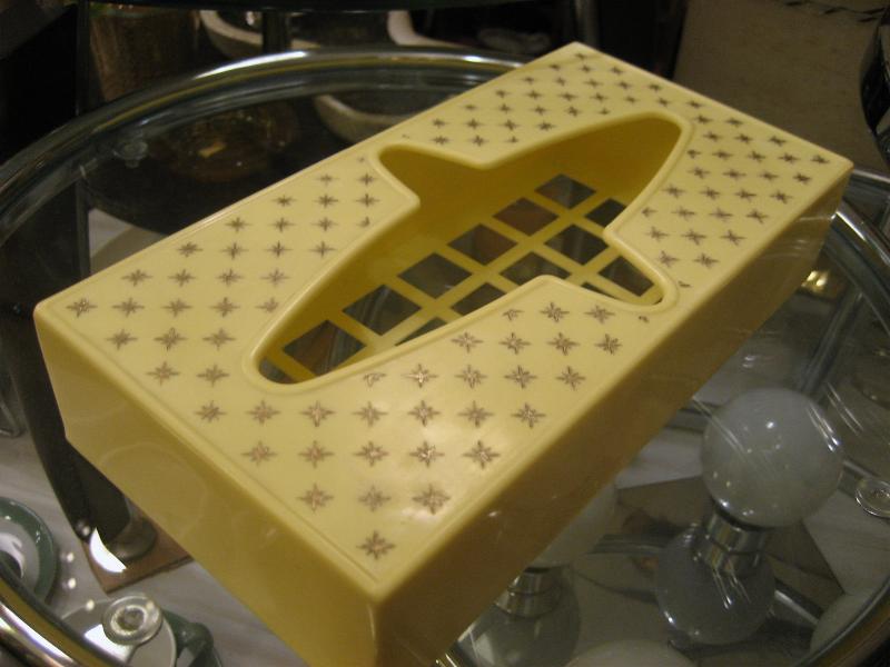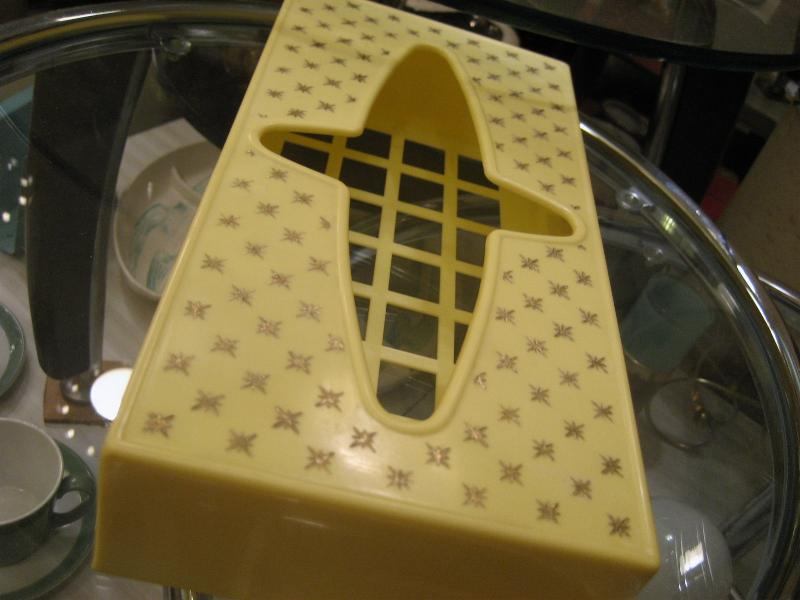 | ビンテージティッシュBOX / 50年代 Rubbermaid, MADE IN USA. ゴールドスターバーストプリントのレトロな50'sティッシュケース。取り出し口の独特なアトミックシェイプが超クールでGOODなビンテージバニティピース! 底面はメッシュトレーになっています。 |