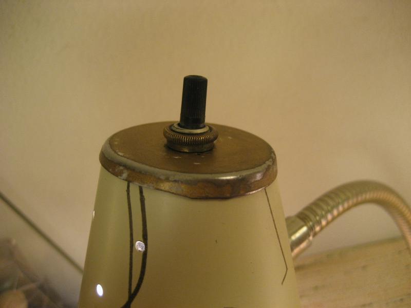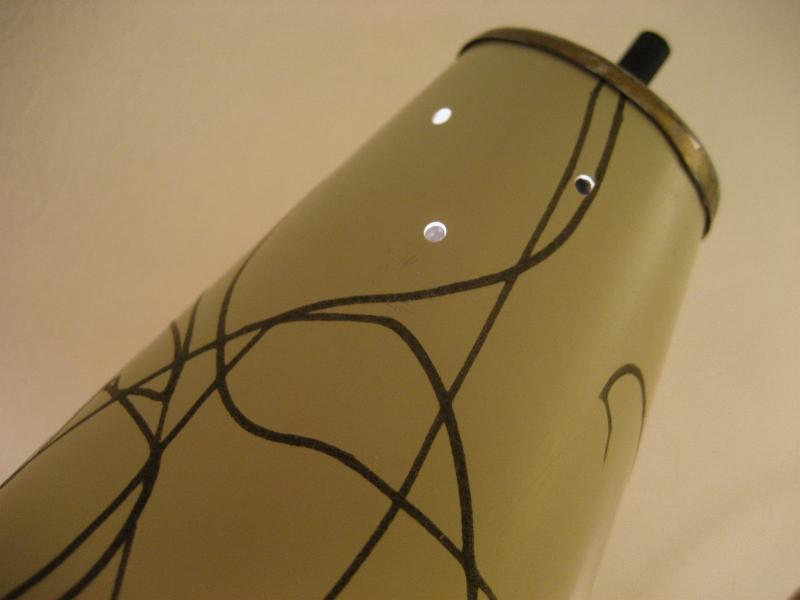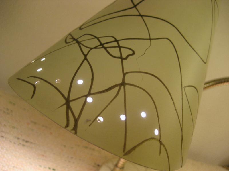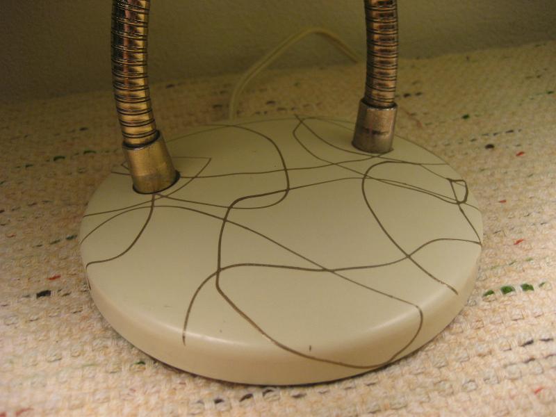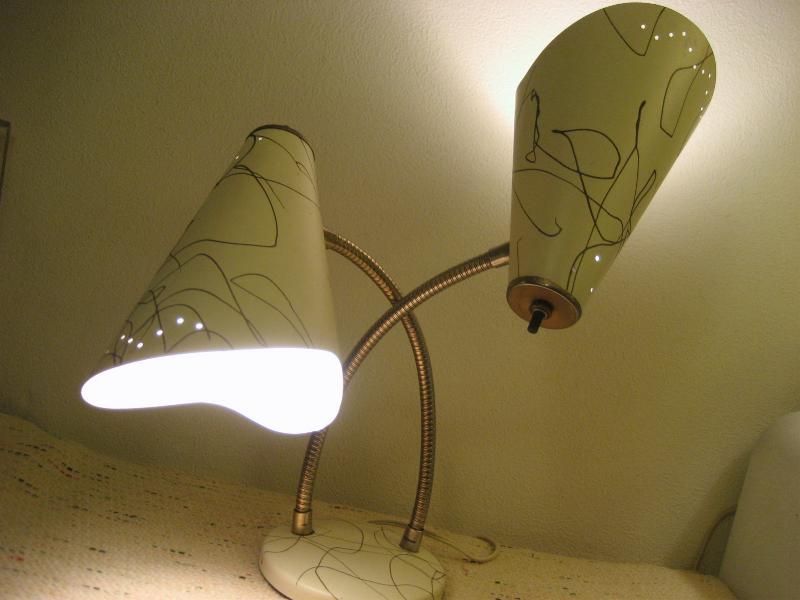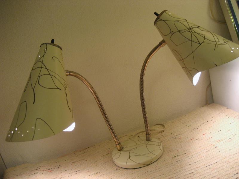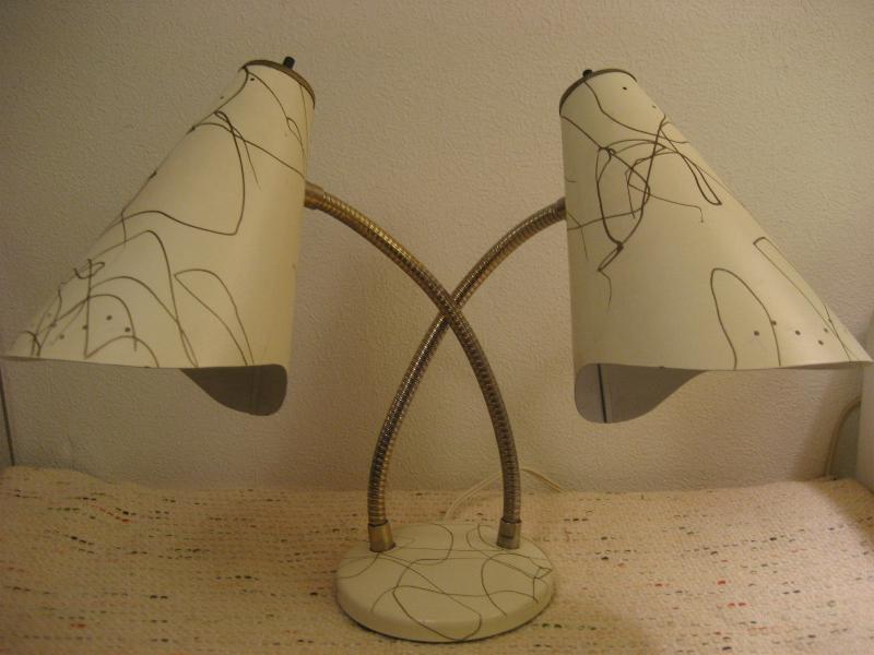 | ビンテージダブルシェードランプ / 50-60年代 USA. アトミックなドレーピング絵柄がクールなフレキシブルアームのデスクランプ。このタイプのアームはポジションが自在にセットできるので便利。。。クールでGOODなビンテージライティングピース! 電源は家庭用コンセント対応コードで、スイッチはシェード後部にそれぞれ付いています。 |