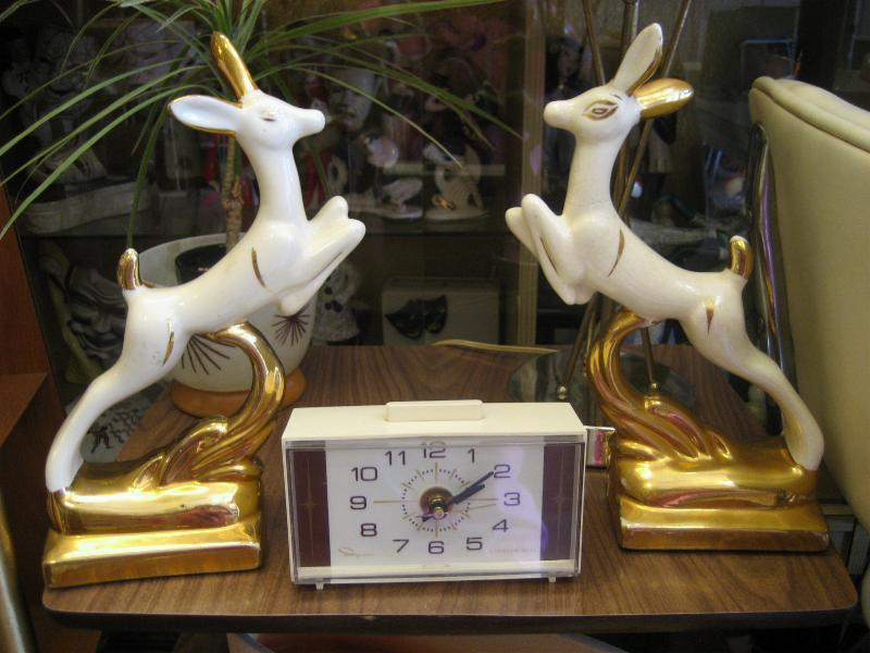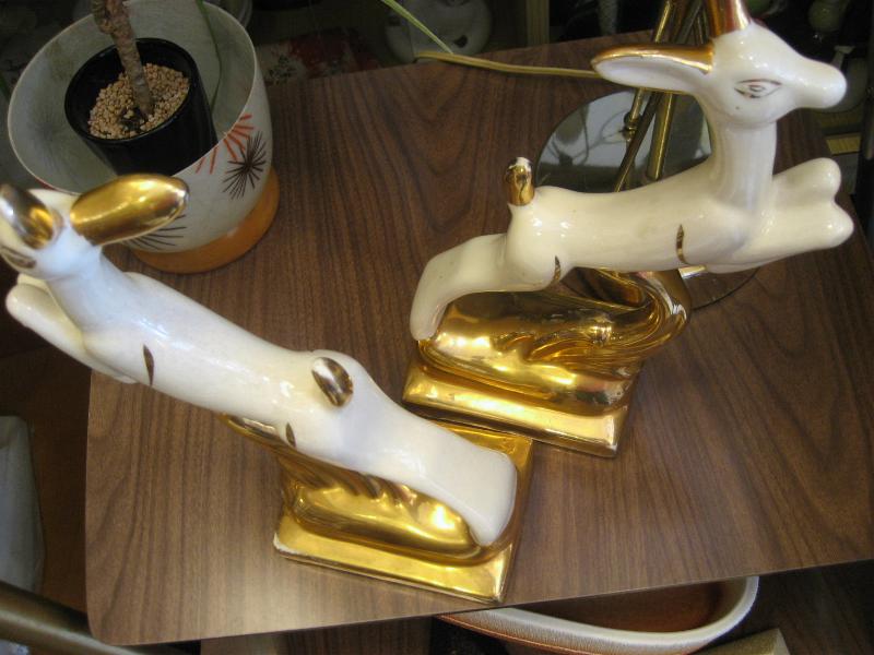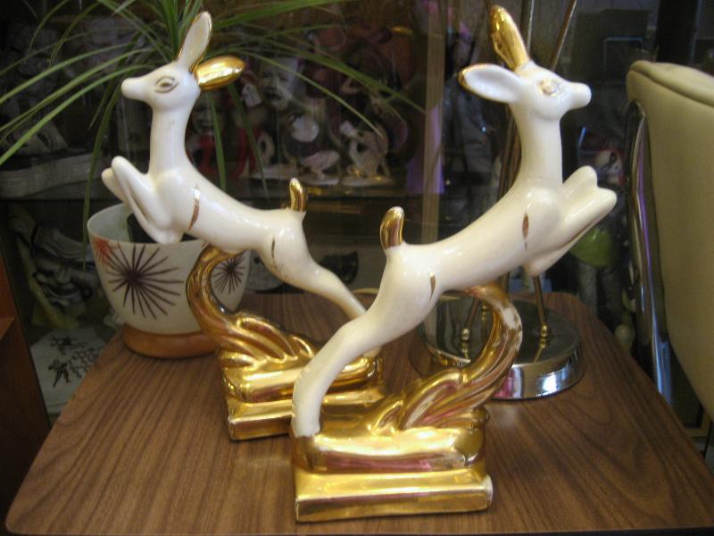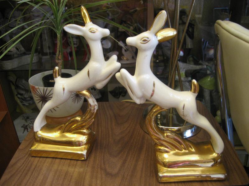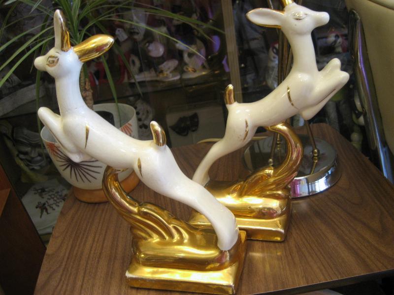 | ペアビンテージデコ / 40-50年代 USA レアでクールなディア(シカ)の置物ペア。陶器メイドでオフホワイ xゴールドカラー。ゴールド部分はおそらく24K使用と思われます。クールでGOODなビンテージデコレーションピース! |