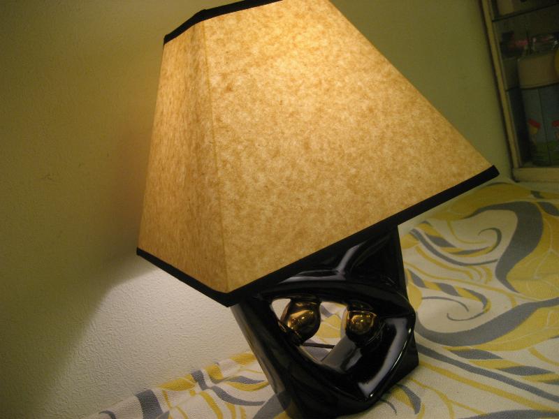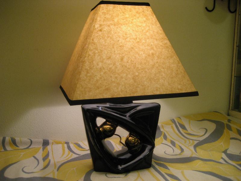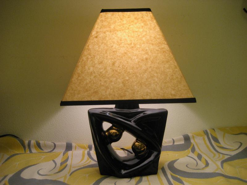 | ビンテージアトミックシェードランプ / 50-60年代 USA. 黒金カラーのブーメランデコがクールなビンテージシェードランプ。シェードはピラミッドシェイプのペーパーマテリアルシェード。クールでGOODなビンテージライティングピース! 電源は家庭用コンセント対応コード。スイッチはソケットに付いていてスライドタイプ。 |