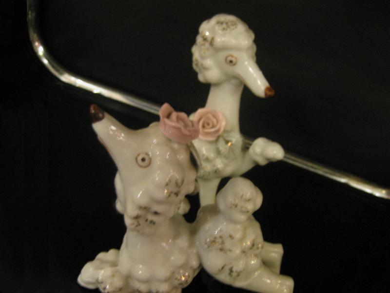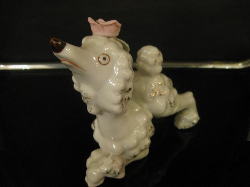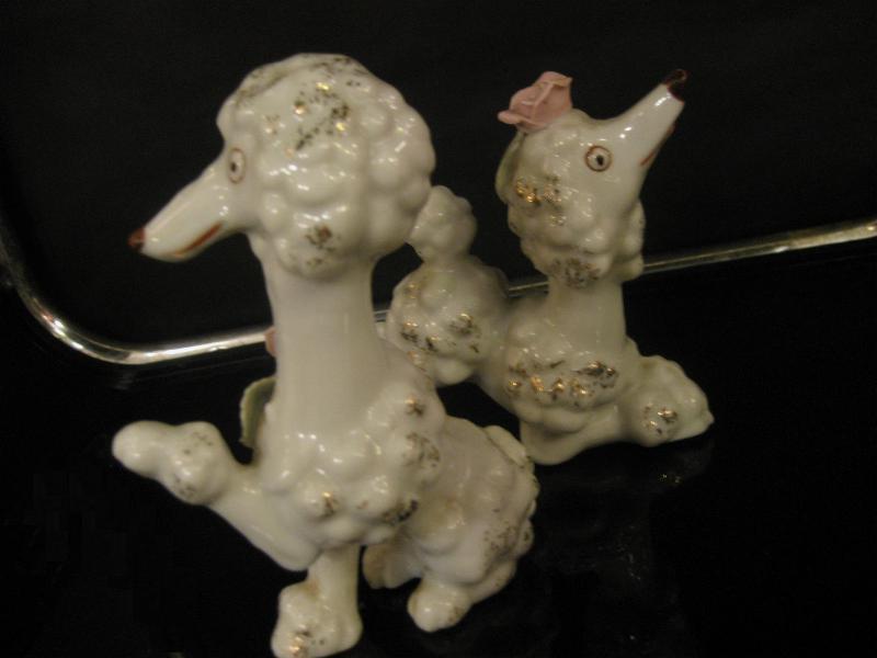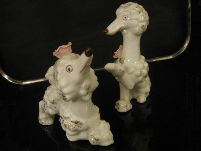 | ペアビンテージプードルデコ / 50年代 USA. 陶器製のプードル置物セット。頭と胸にそれぞれ(バラのコサージュでしょうか?)アクセントフラワーデコ付き。ディスプレイにGOODなクール&キュートデコレーションピース! |