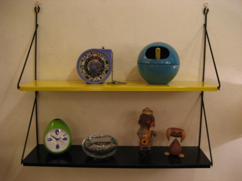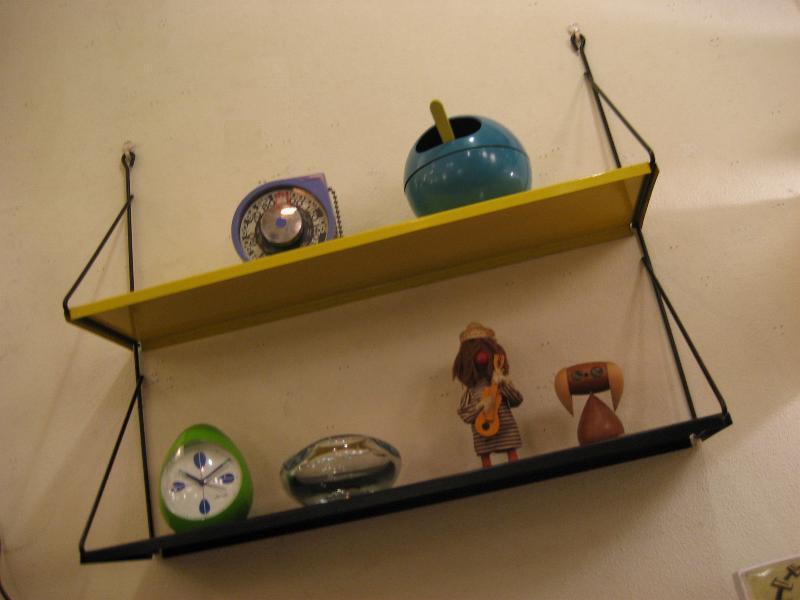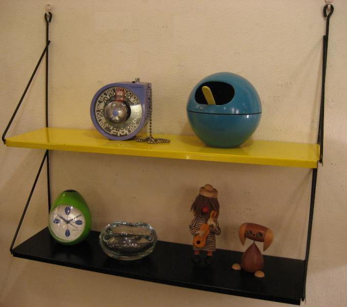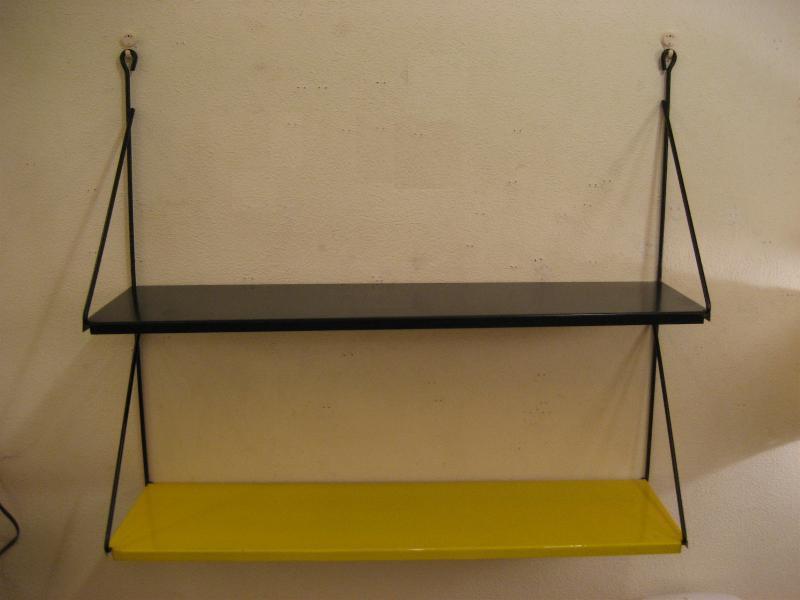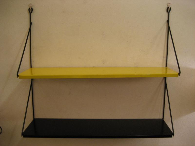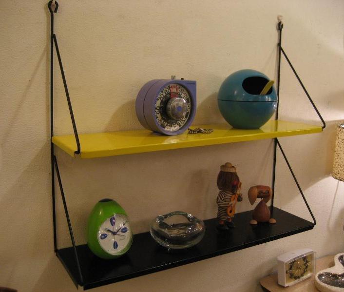 | ビンテージアトミックモダンウォールシェルフ / 50-60年代 USA アイアンフレームにメタルパネルのビンテージ壁掛け飾り棚。ブラック・イエロー2色カラーのシェルフで上下設置は自由に入れ替えセットできます。ディスプレイアイテムだけでなく、CDやDVD・BOOK etc... 今の物にも結構いろいろ使えて便利。。。ウォールスペースにクールでGOODなミッドセンチュリーピース! |