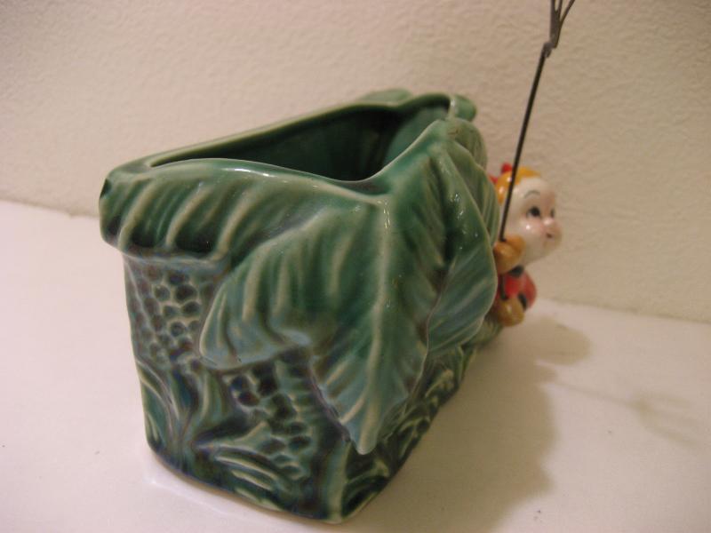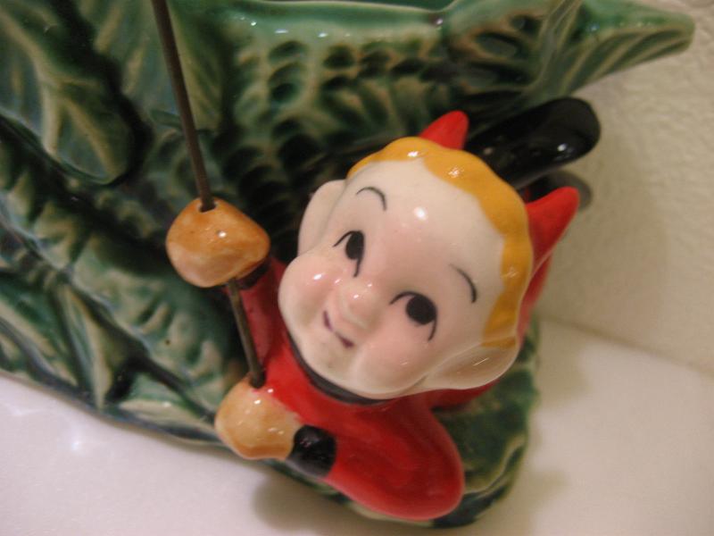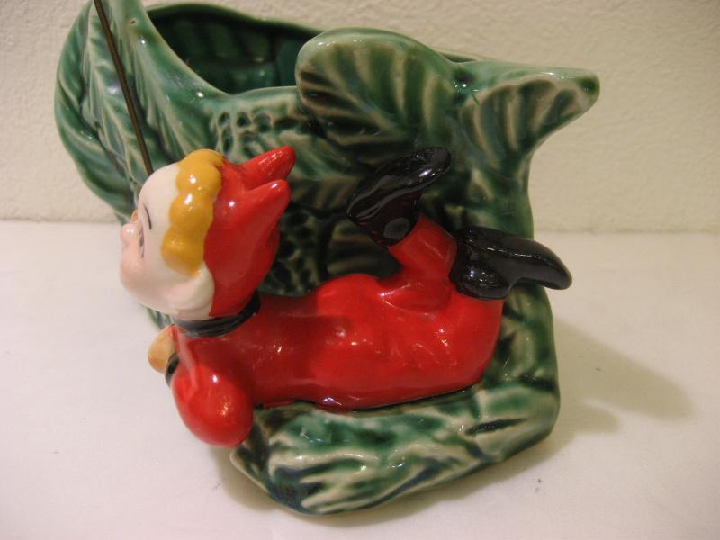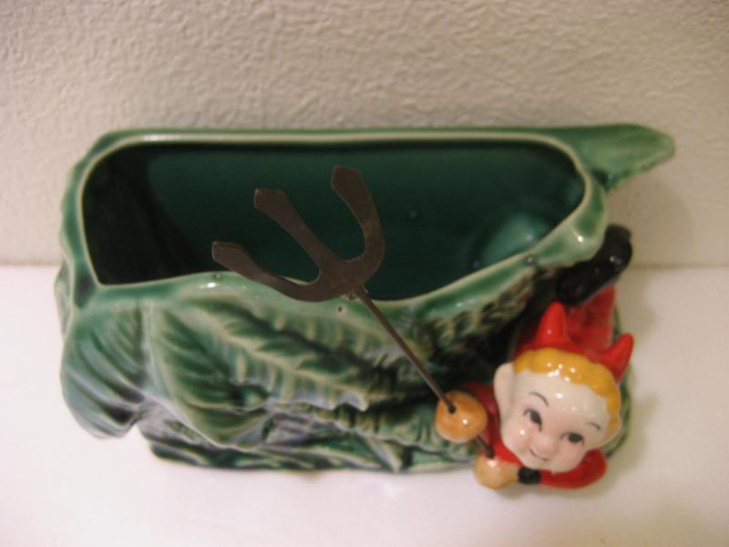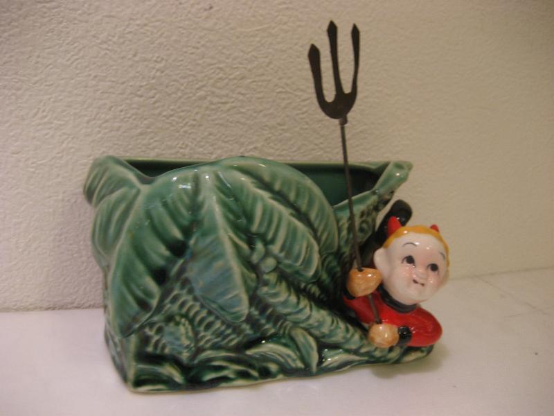 | ビンテージキッズデビルプランター / 50年代 USA 陶器製のキッズデビルプランターベース。ポットはグリーンカラーのリーフスタイル。デビルの定番ピッチフォークも持っています。クールでGOODなビンテージデコレーションピース! |