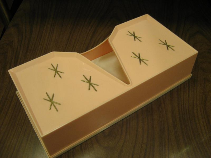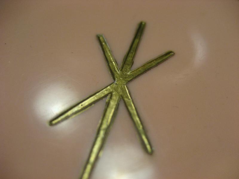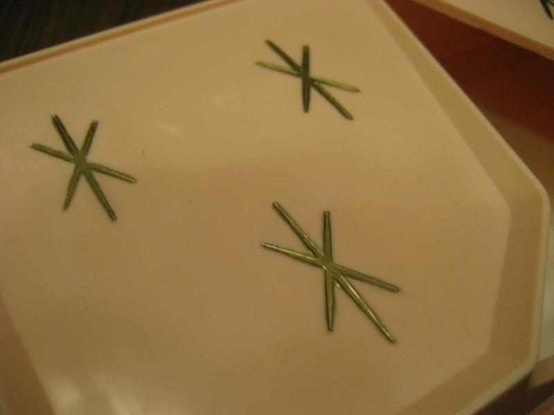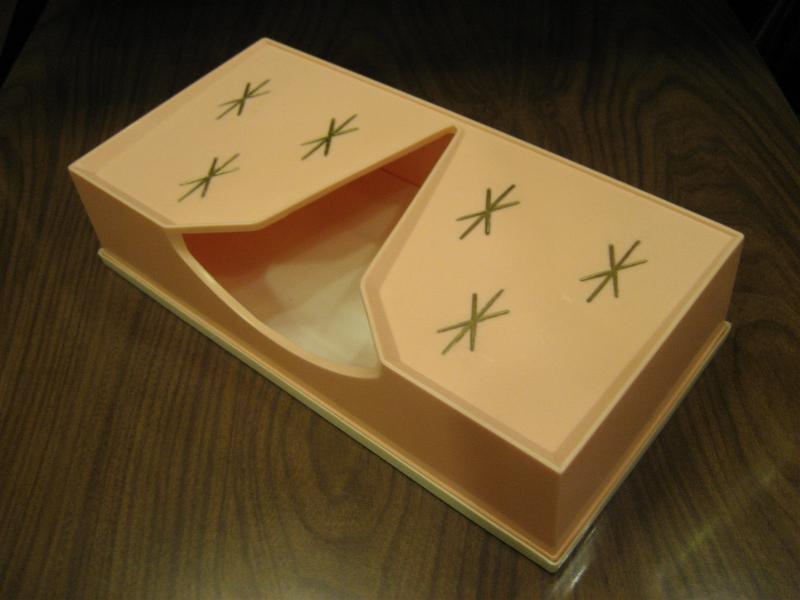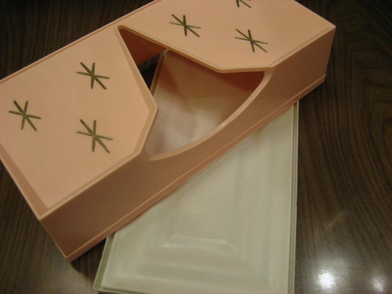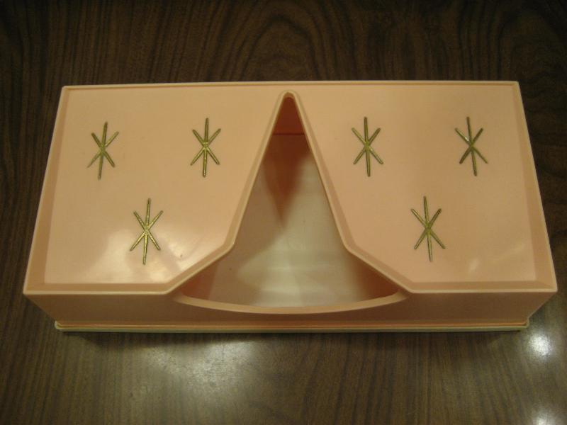 | ビンテージティッシュケース / 50-60年代 Lustro Ware, MADE IN USA. ピンクボディにゴールドスターバーストアクセントのレトロなティッシュケース。取り出し口がアトミックシェイプでクール&キュートなビンテージバニティピース! 底面はラバーメイドのカバーになっています。 |