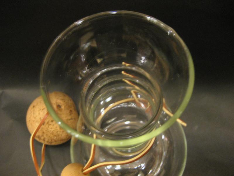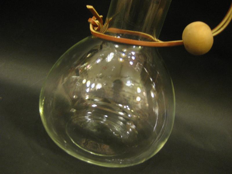 NY USA. パイレックスの冷たい飲み物用のフラスコシェイプガラスカラフェ。レザーストラップにコルクボールのキャップがとってもキュート!レトロでGOODなビンテージモダングラスウエア。 洋書のプライスガイドにも掲載されています。。。 ※耐熱ではありませんのでご注意を・・・(COLD専用) |