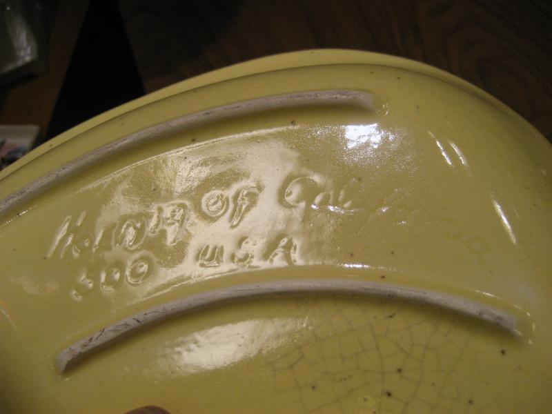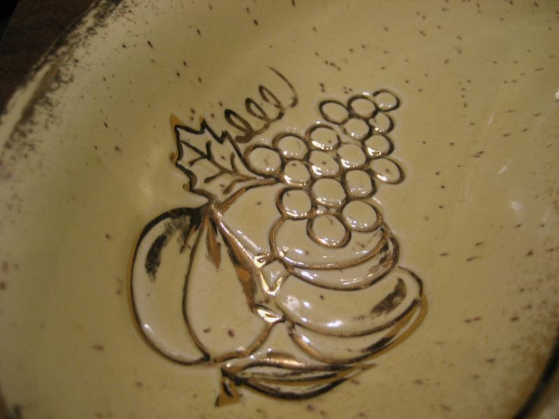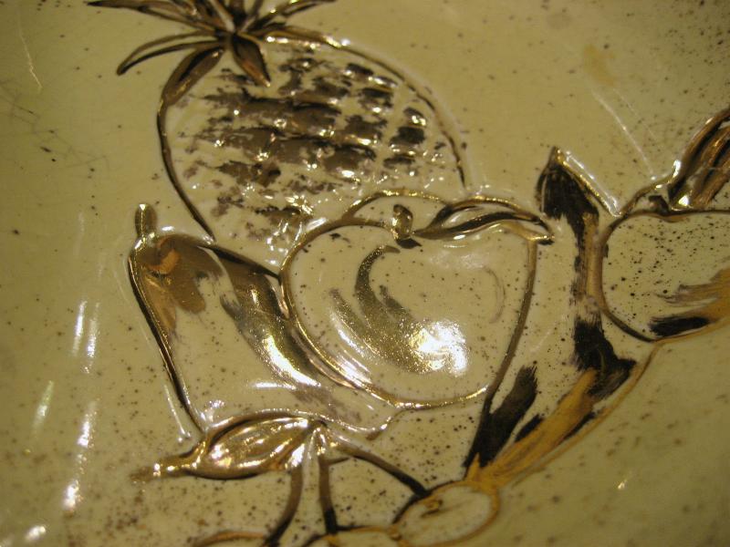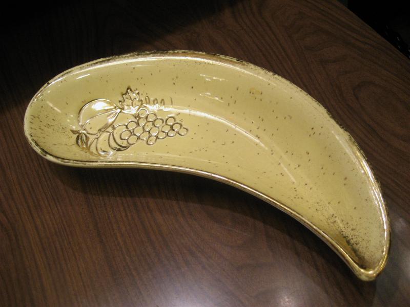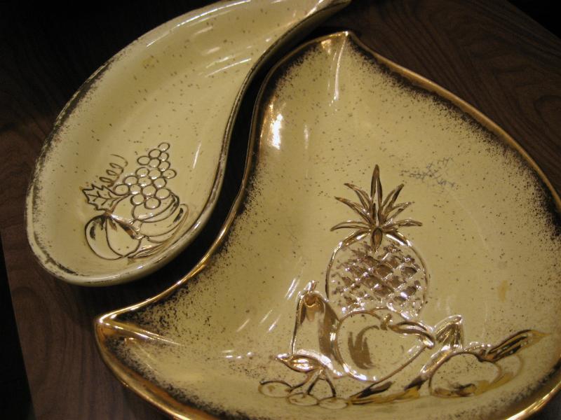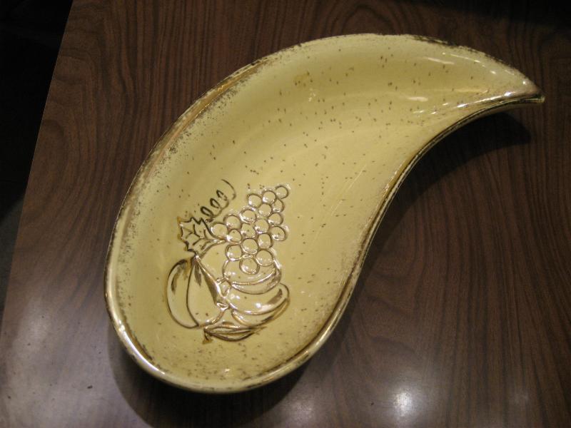 USA. カリフォルニア陶器メーカー、"Hoenig" の ブーメランシェイプサービングディッシュセット。イエローベースにゴールドフレークアクセント。フルーツ絵柄で50年代のアメリカっぽいデザインです! クールでGOODなビンテージテーブルセット! |