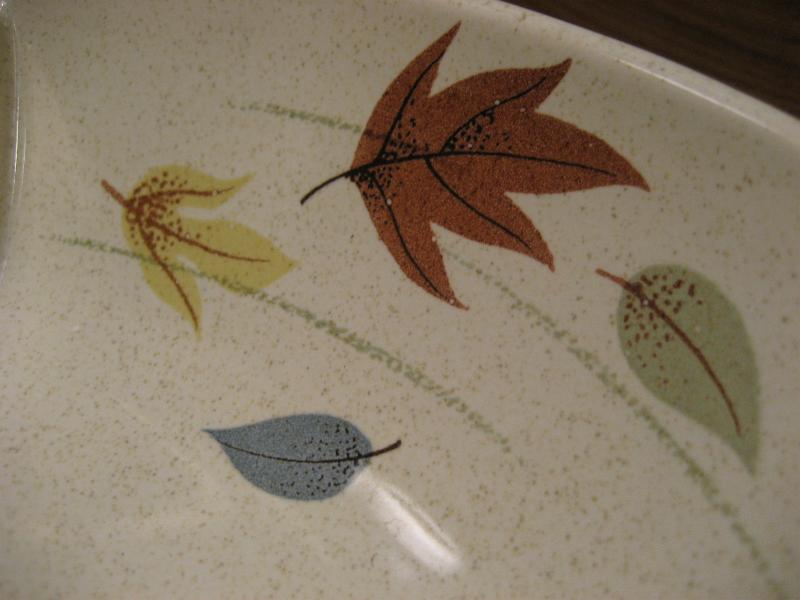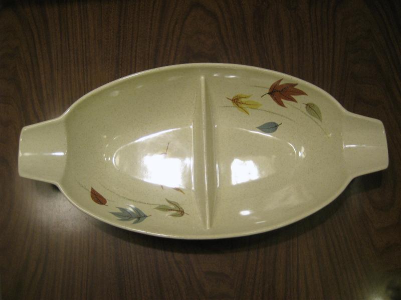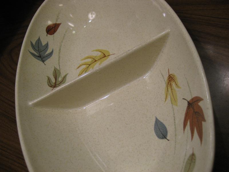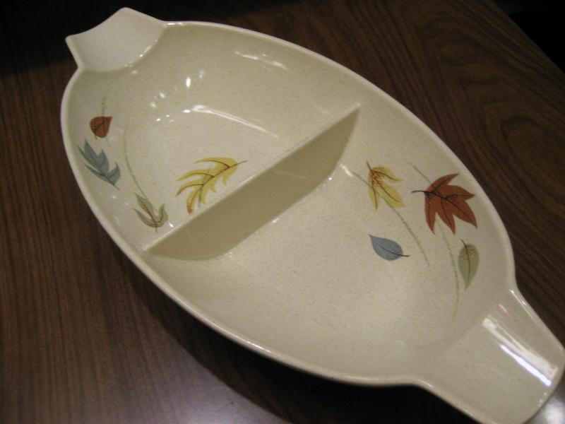 | ビンテージスプリットディッシュ / 50年代 Franciscan Autumn, USA. カリフォルニア陶器の代表的なメーカー、"フランシスカン" の "Autumn" シリーズで仕切りの付いたボウルタイプディッシュ。モダンなリーフ絵柄デザインでいろいろ使えそうな少し深さのあるお皿。ランチプレートなどにもおススメです。。。クールでGOODなビンテージテーブルピース! |