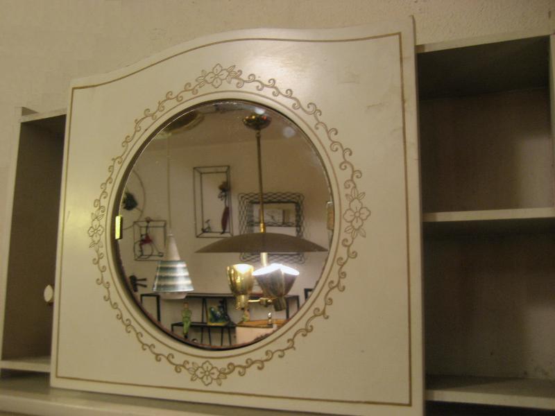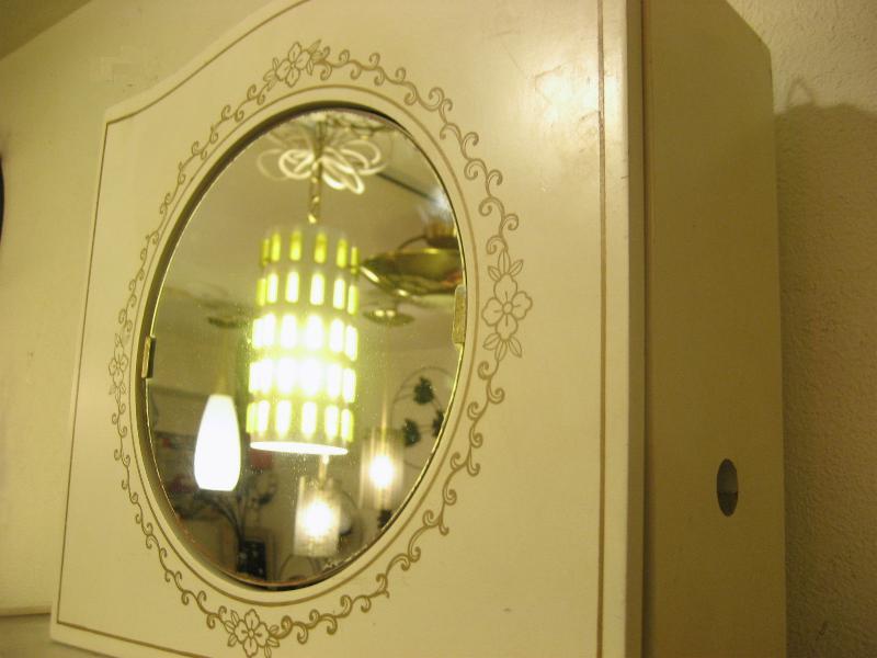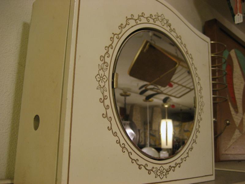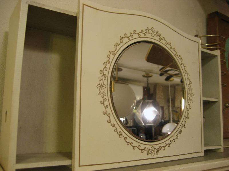 | ビンテージバスルームミラーシェルフ / 50-60年代 USA ウッドメイドでアーリーアメリカンなイメージのビンテージウォールミラーシェルフ。両サイドがスライドポケットになっていてコスメやデンタルアイテムの収納ができます。ボディカラーはオフホワイトにゴールドプリント。センターのミラーは回転して目隠しにもなります。クールでGOODなビンテージバニティピース! |
