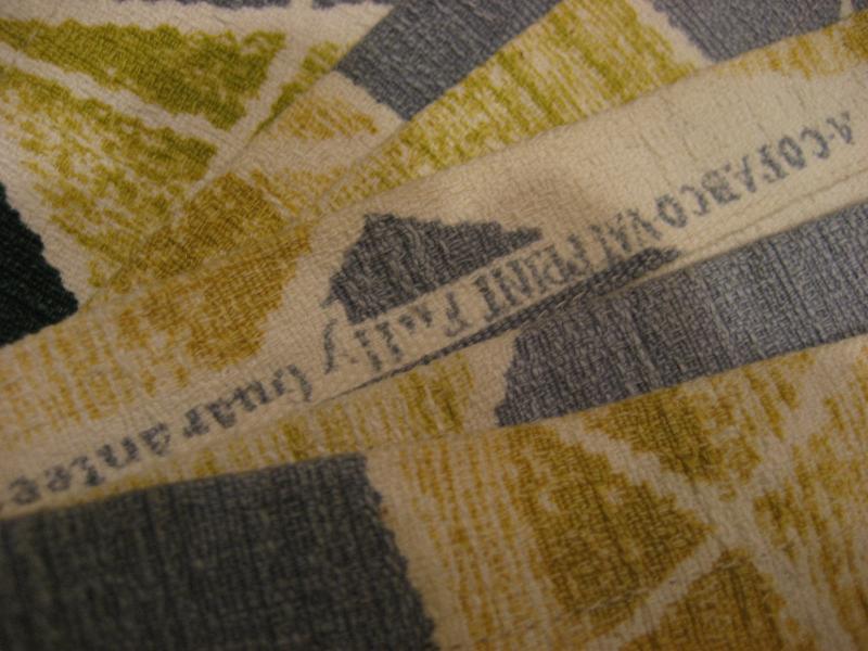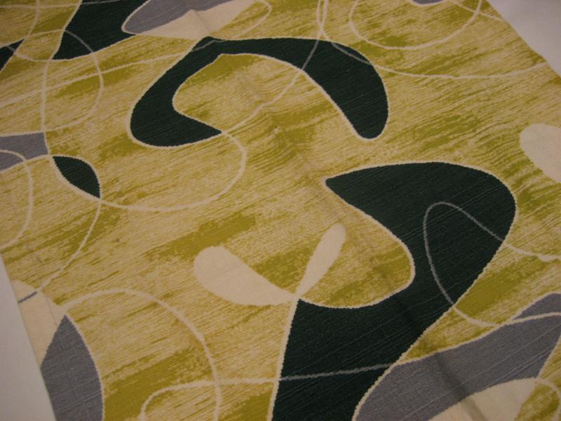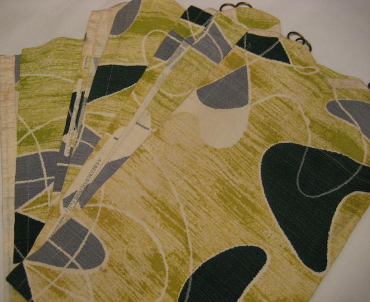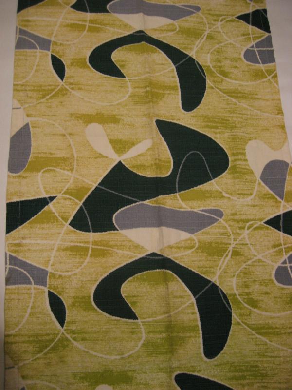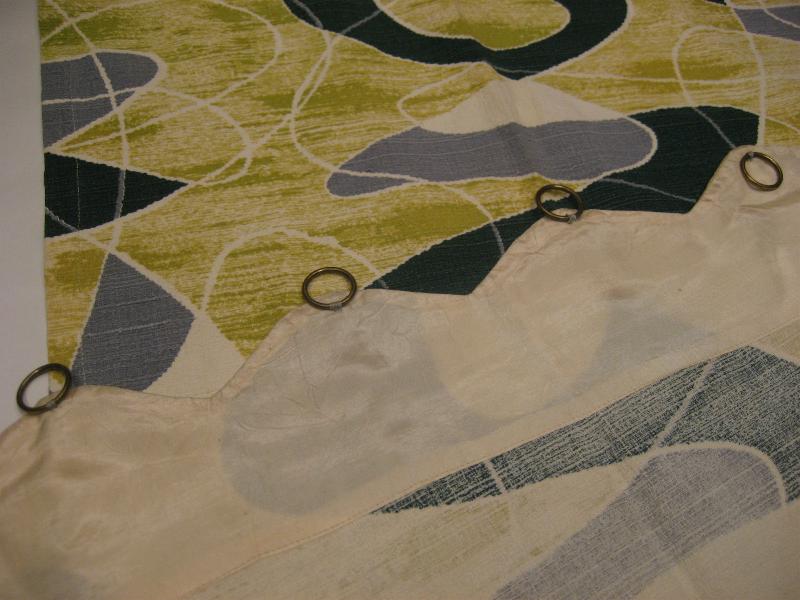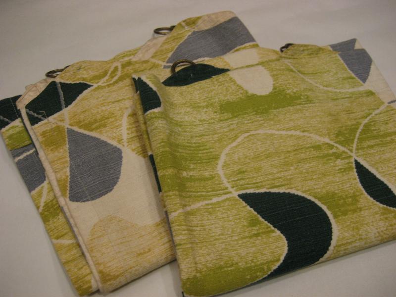 | ビンテージアトミックカーテン / 50年代 USA. アトミックなブーメランのフリーハンドプリントがクールなスモールカーテンパネルセット。パネルトップはウェーブフィニッシュでブラスリングが4個ついています。カラーはグリーングレーライムグリーンベージュアイボリーなど。。。 クールでGOODなビンテージウィンドウピース! マテリアルはコットンです。 |