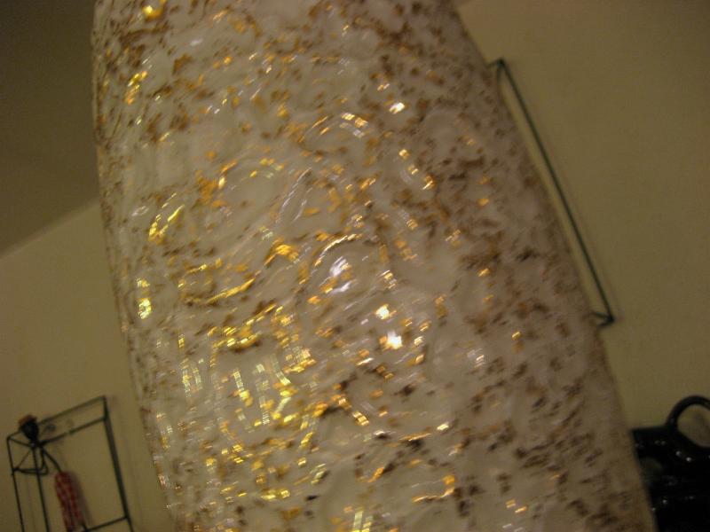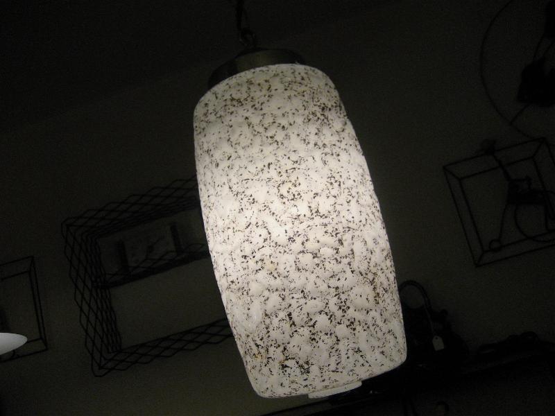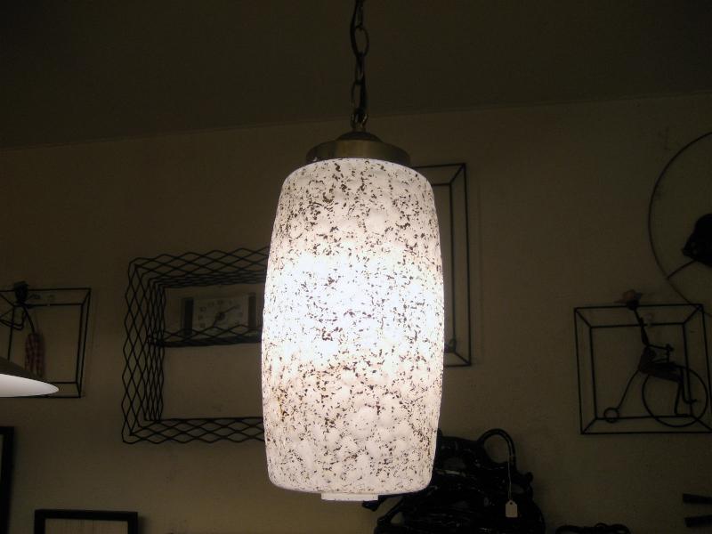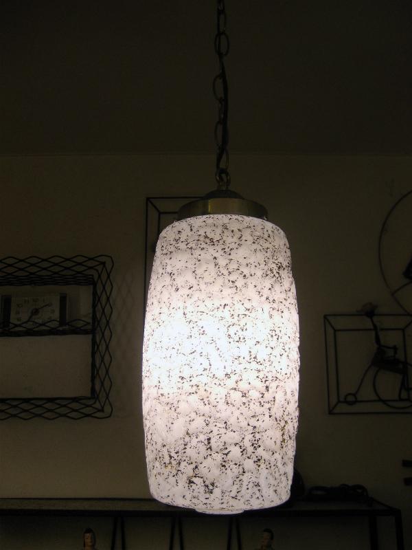 | ビンテージペンダントランプ / 50-60年代 USA ガラスメイドのシリンダータイプシェードで表面に凹凸感のあるビンテージシーリングランプ。ホワイトベースにゴールドフレークアクセント柄が50'sなランプです。クールでGOODなビンテージライティングピース! 電源は引っ掛けシーリングに交換済みですのですぐに設置可能です。 ※天井吊り下げ長さは店頭ディスプレイの関係で長めに設定していますが、ご希望の長さに調節可能です。 |