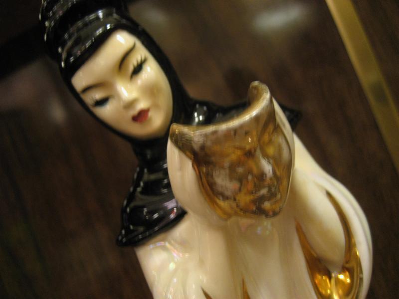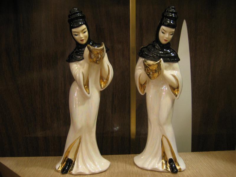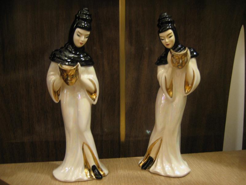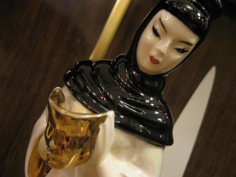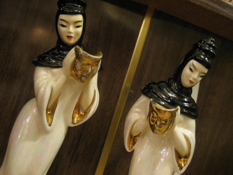 | ペアビンテージツーフェイスデコ / 50年代 USA. とってもきれいな顔立ちの陶器製オリエンタルレディダンサー置物です。それぞれ、手に泣き笑いを持ったクールアクセント。セラミック・アーツ・スタジオ社の物と近いフォルムでかなりリスペクトされたデザインと思われます。 |