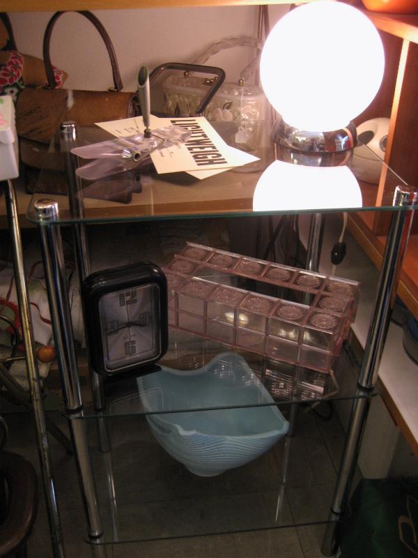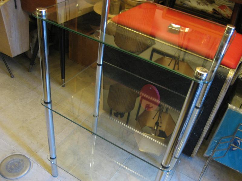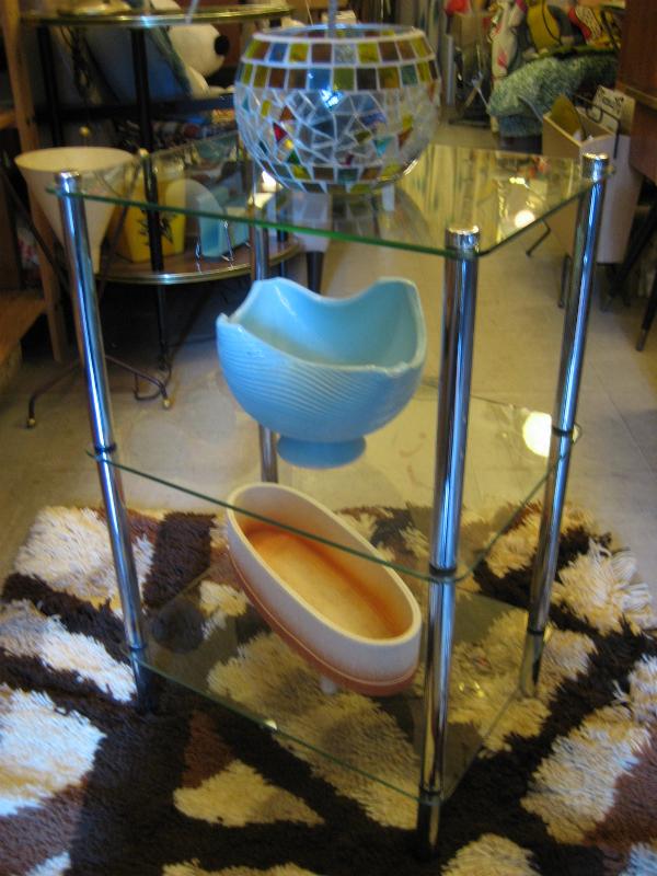| ビンテージガラスシェルフ / 70-80年代 USA ガラスとクロームレッグのビンテージモダンフロアシェルフ。シェルフは3段の飾り棚タイプ。お部屋のコーナーシェルフやソファまたはチェアサイドなどにもクールでGOODなビンテージフロアピース! |