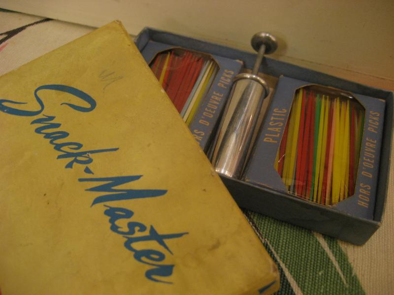 MADE IN USA. オリジナルBOX入りデッドストックのパーティピックセット。カラフルな数色のプラスチックメイドのピックがパッケージされて2パック。メタルメイドのパーツは使用方法不明ですが、なんかレトロでいい感じです! 外箱には"Snack Master"のプリント。クールでGOODなビンテージコレクティブルピース! |