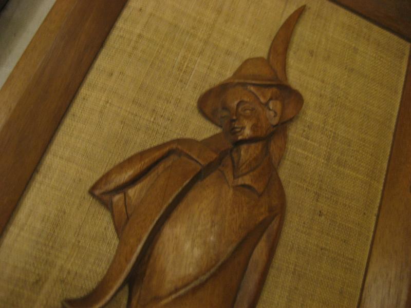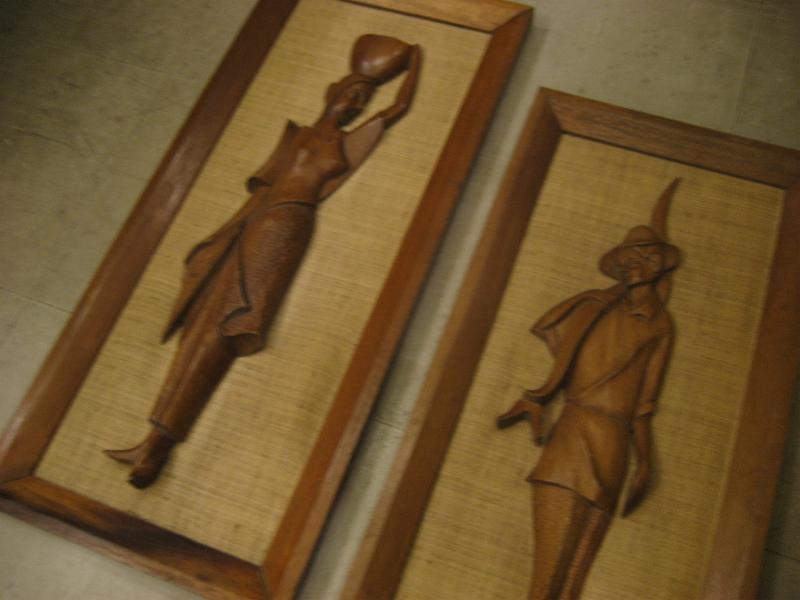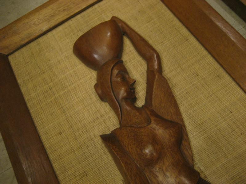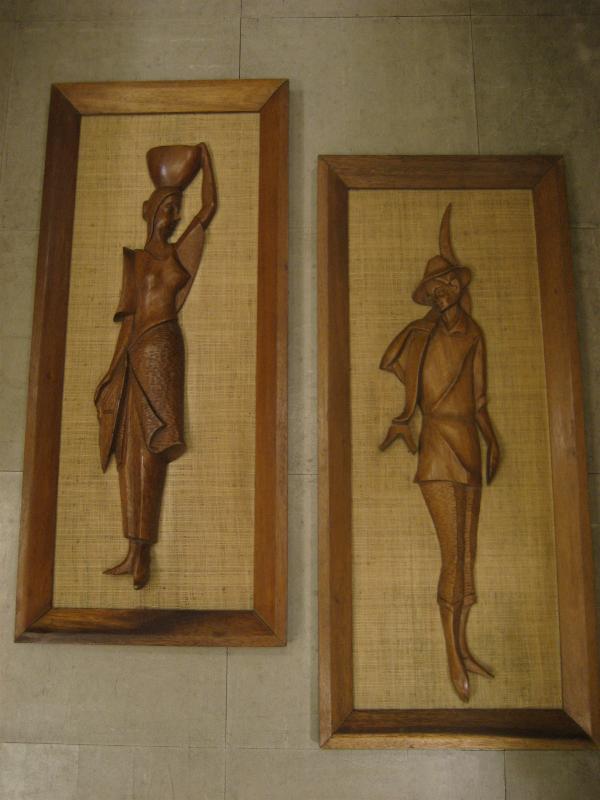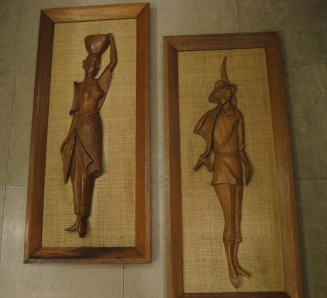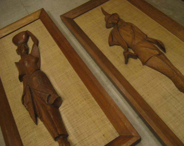 | ペアビンテージミッドセンチュリーウォールデコ / 60年代 USA ウッドフレームにウッドアクセント、バーラップバックのスカンジナビアンな壁掛けセット。女性と男性のウッドモチーフ。モダンでGOODなビンテージウォールデコレーションピース! |
