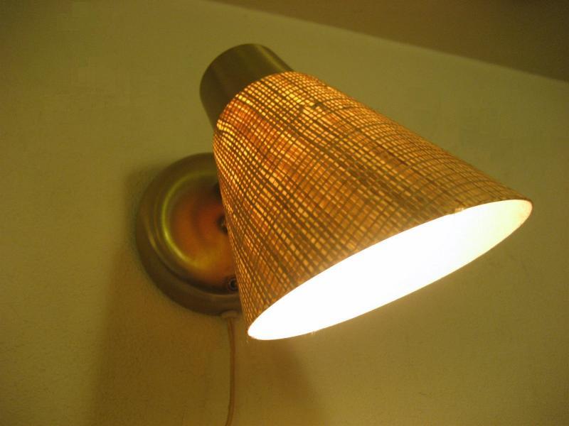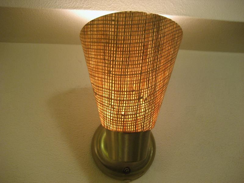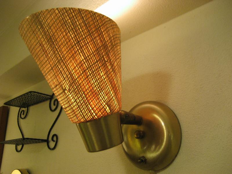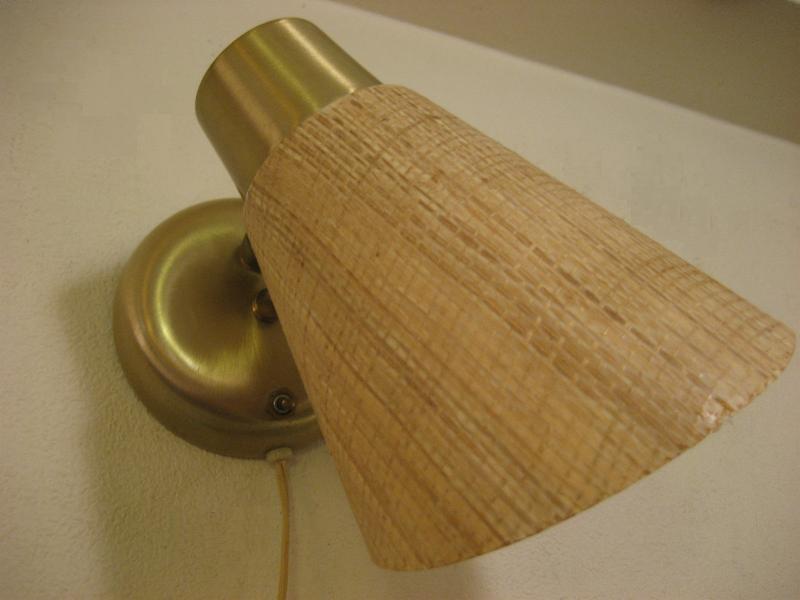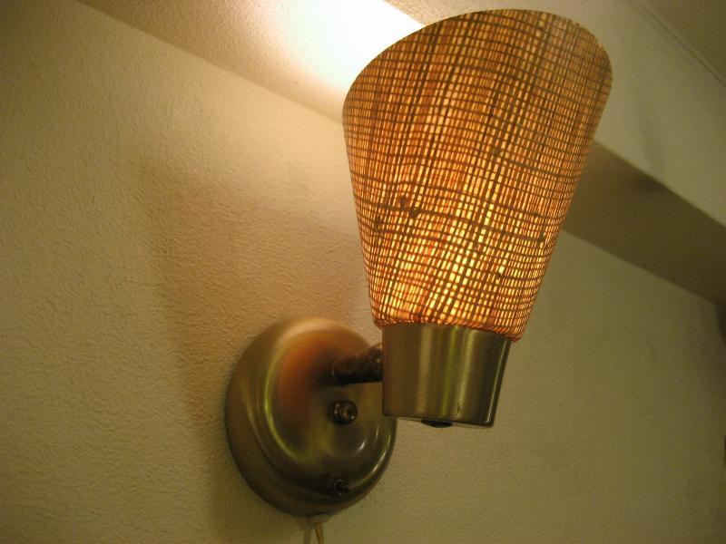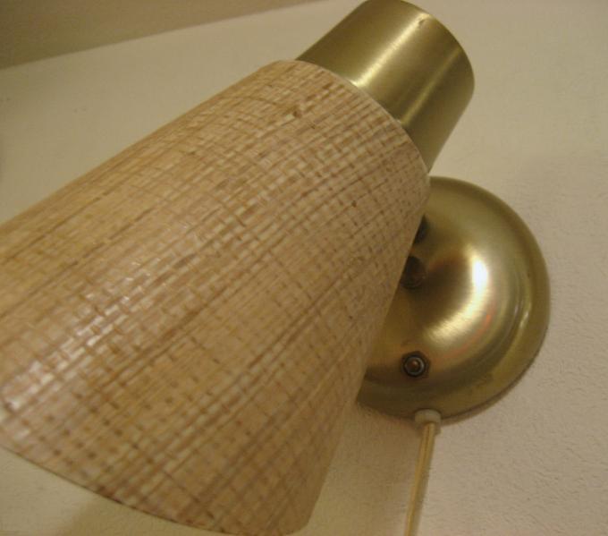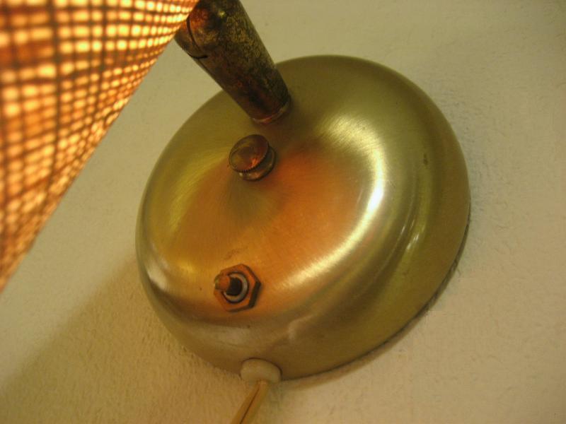 | ビンテージアトミックウォールランプ / 50-60年代 USA バーラップタイプのファイバーグラスシェードにゴールドブラスメタルパーツのビンテージ壁掛けスポットライティング。シェード方向は好みに合わせて360度可動しますので、いろいろなポジションに対応可。クールでGOODなビンテージライティングピース! 電源は家庭用コンセント対応でスイッチはマウントベースに付いていてPUSH式(ON/OFF)です。 |