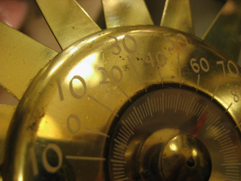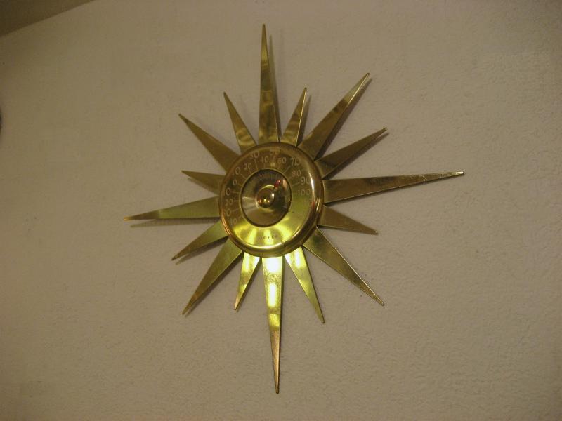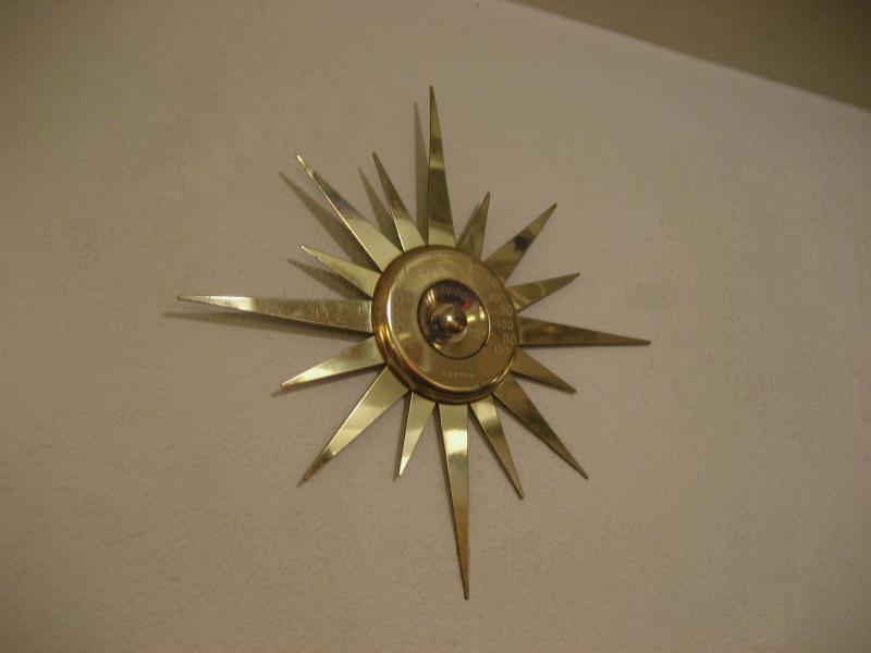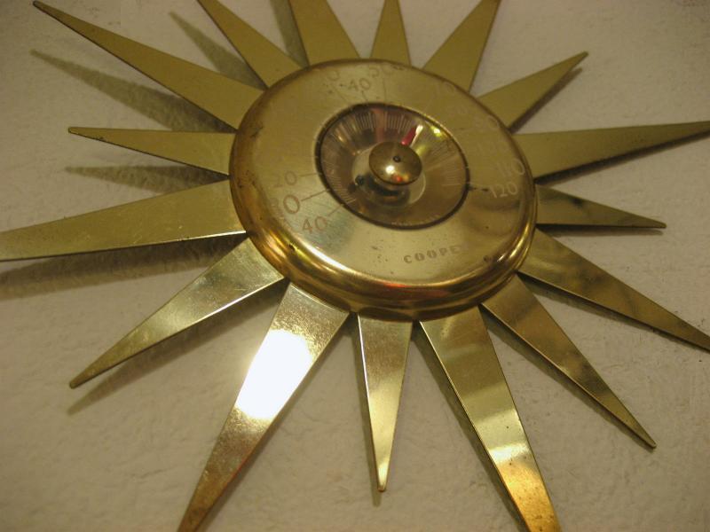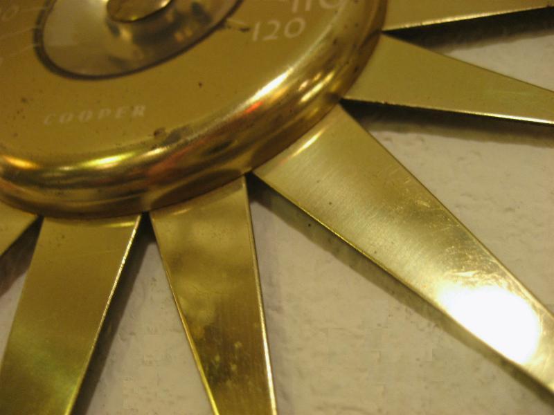MADE IN USA. "The Cooper Thermometer Company"のスターバーストシェイプのクールな壁掛け温度計。ゴールドブラスメイドで華氏表示用の針はレッド。スターバーストやサンバーストクロックとのマッチングもサイコー! クールでGOODなビンテージウォールピース! |