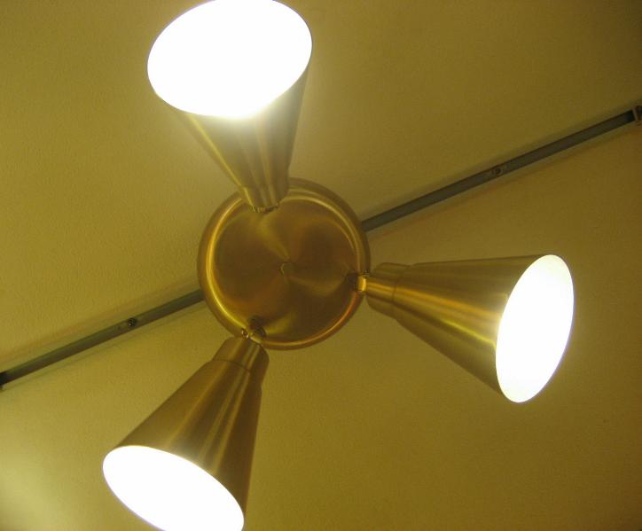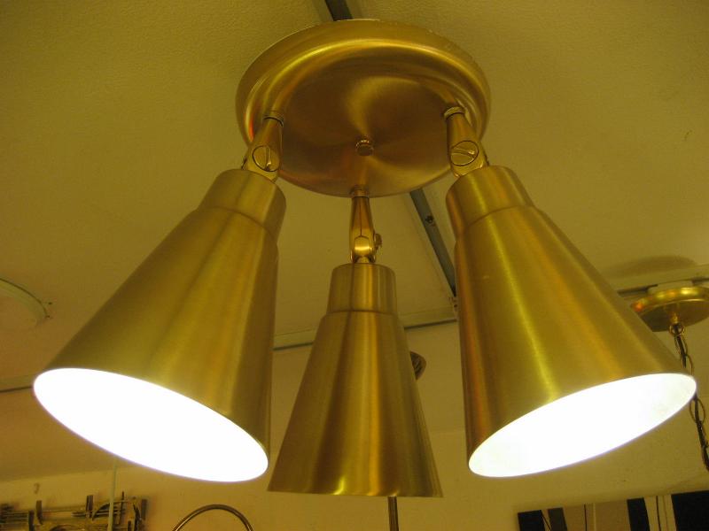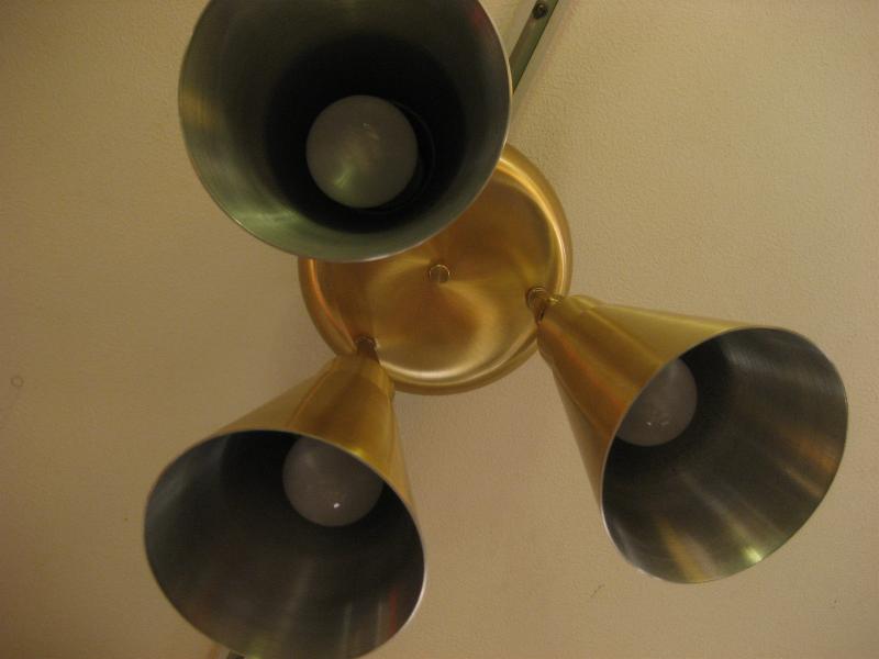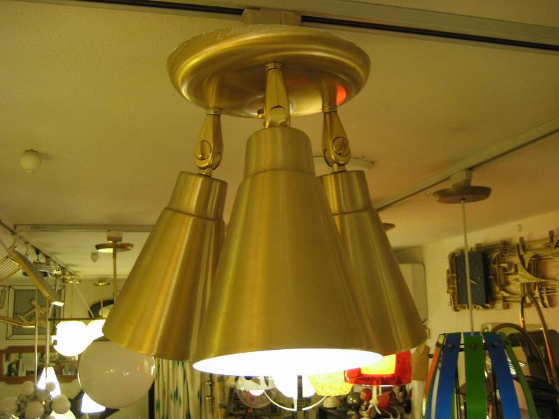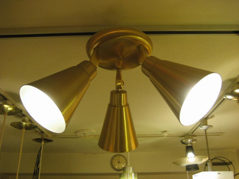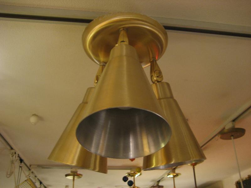| ビンテージ3スポットシーリングランプ / 50-60年代 USA. トリプルメタルシェードの天井シーリングランプ。各シェードの角度や方向がある程度自在にセットできて好みのポジションが可能。クールでGOODなミッドセンチュリーライティングピース! 電源は引っ掛けシーリングに交換済みですのですぐに設置可能です。 |