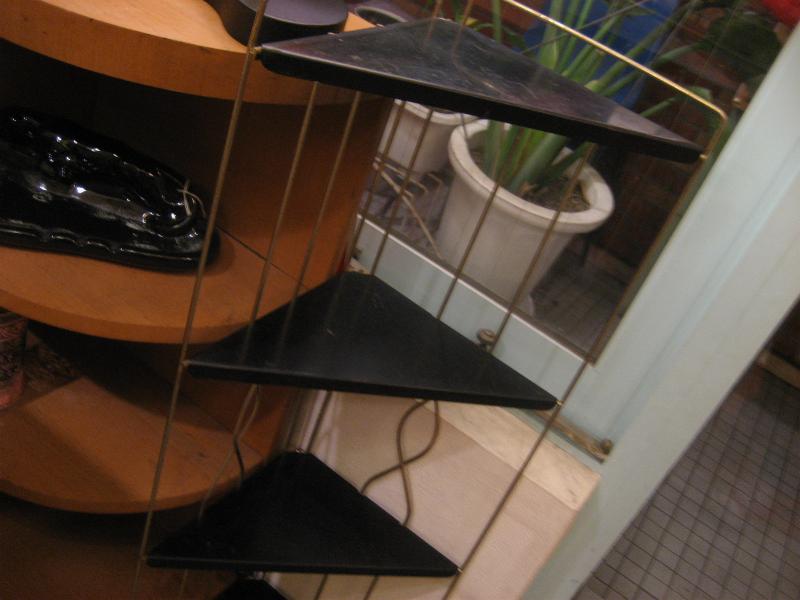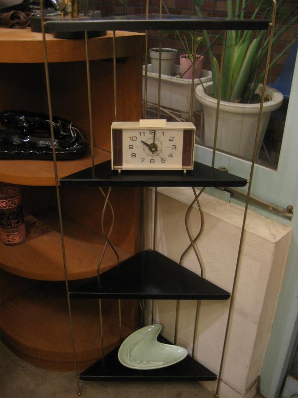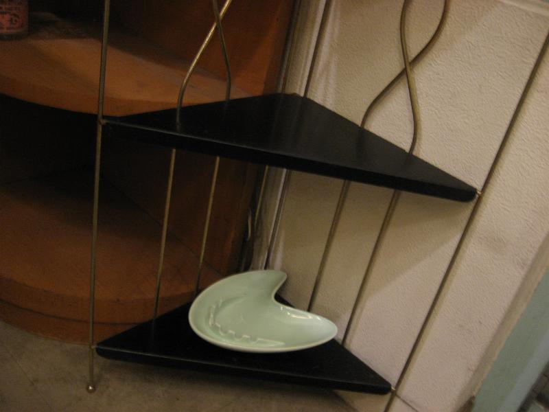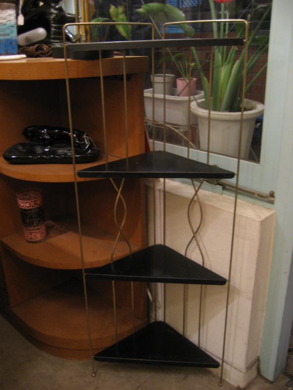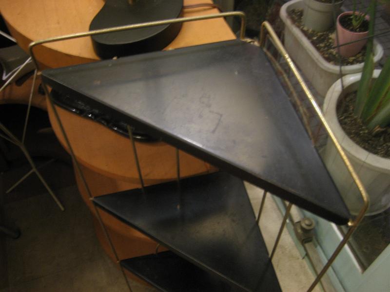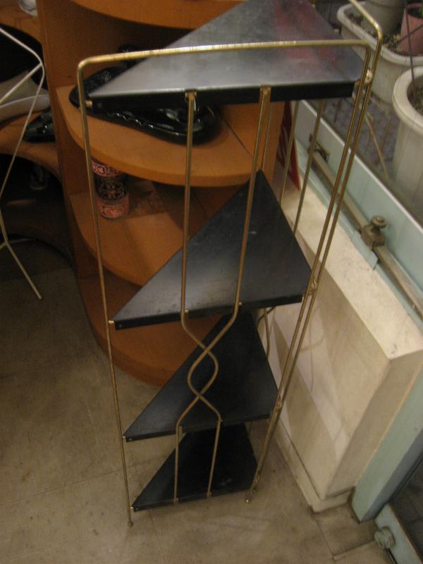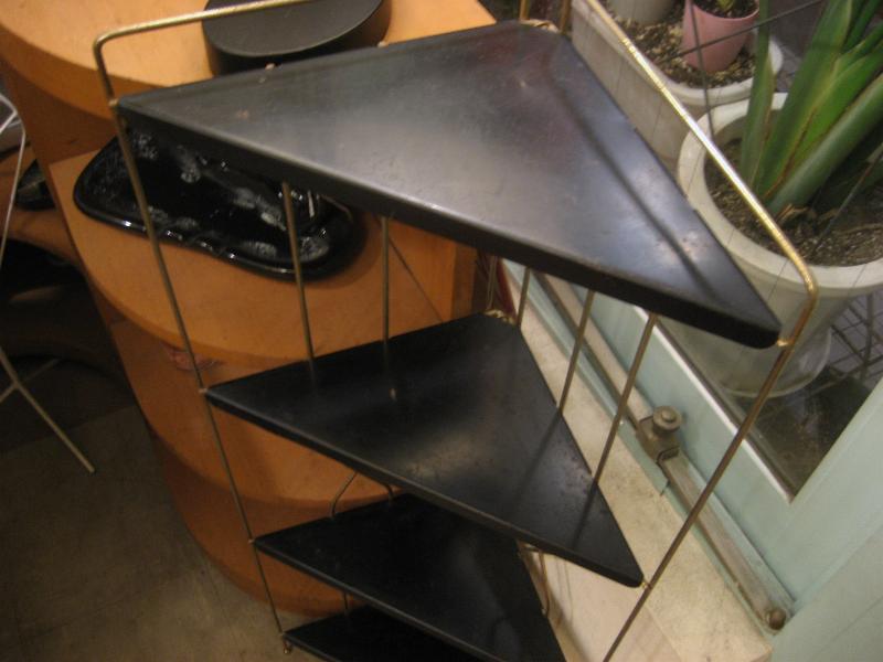 | ビンテージアトミックフロアシェルフ / 50年代 USA. メタルメイドのビンテージフロアシェルフ。ブラックパネルの4段シェルフにゴールドワイヤーフレームでフォールディングタイプ。お部屋のコーナーやスペースにクールでGOODなビンテージフロアピース! |