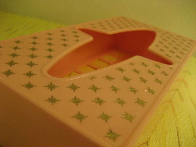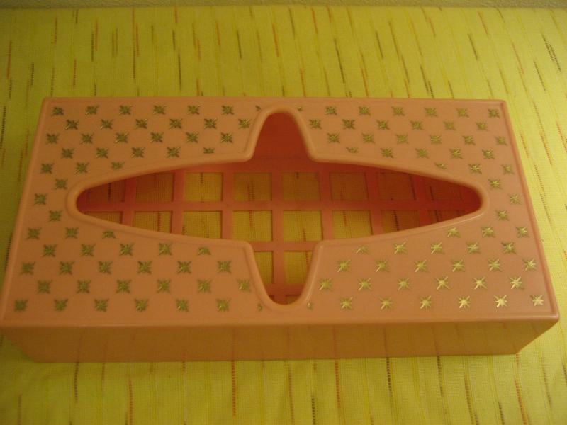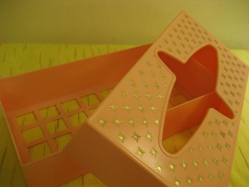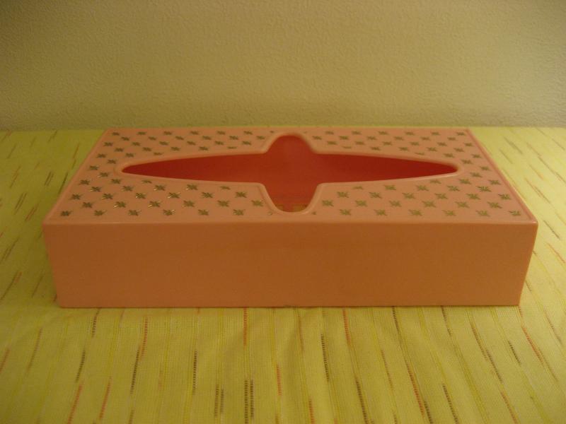 | ビンテージアトミックティッシュケース / 50年代 Rubbermaid, MADE IN USA. ピンクにゴールドスターバーストプリントの50'sティッシュボックス。取り出し口のアトミックシェイプがクールでGOODなビンテージバニティピース! 底面はメッシュトレーになっています。 |
