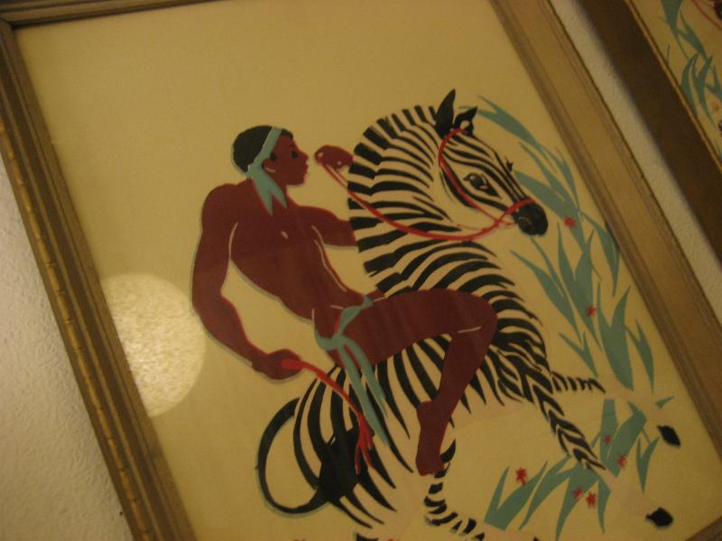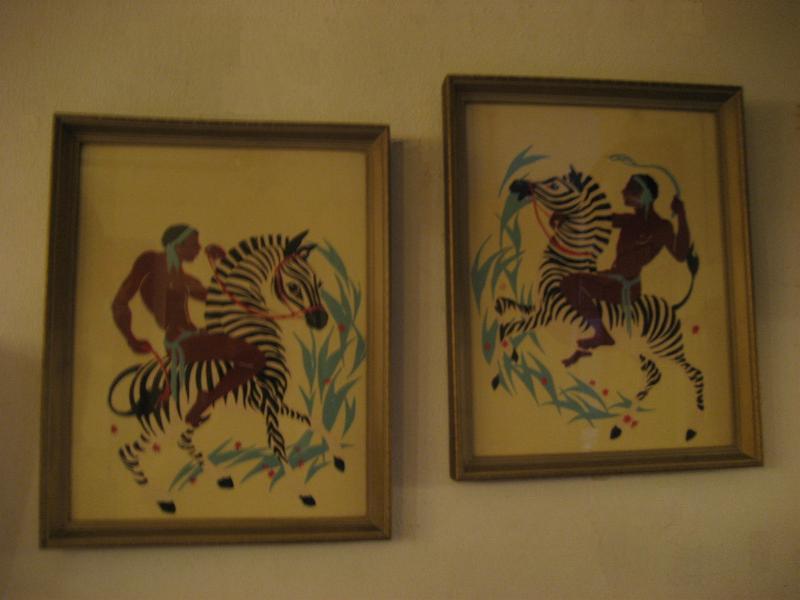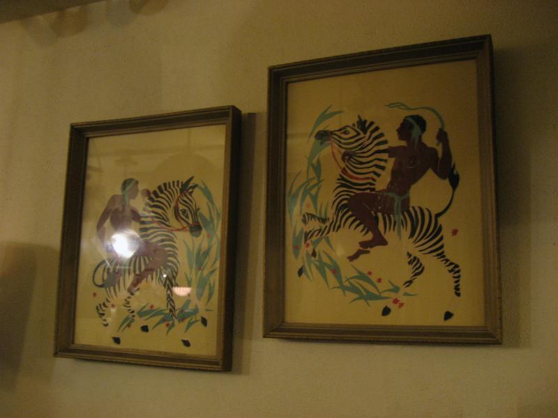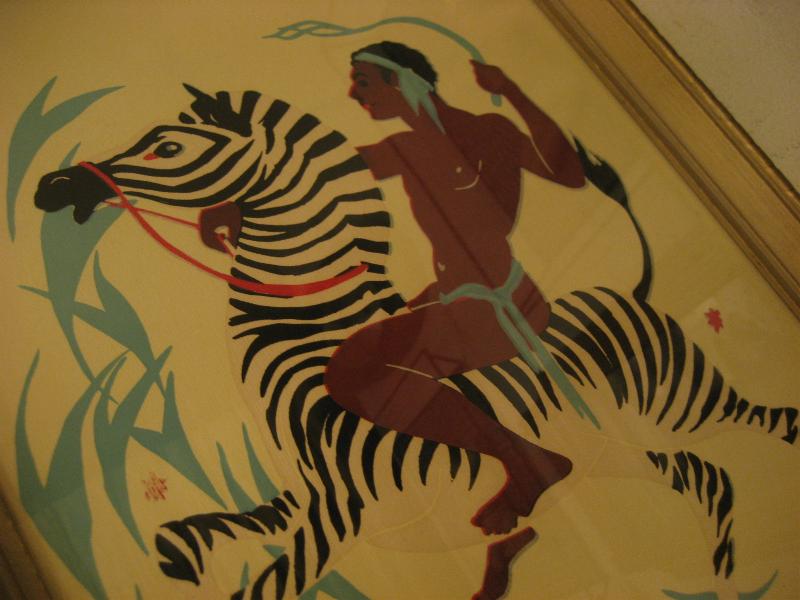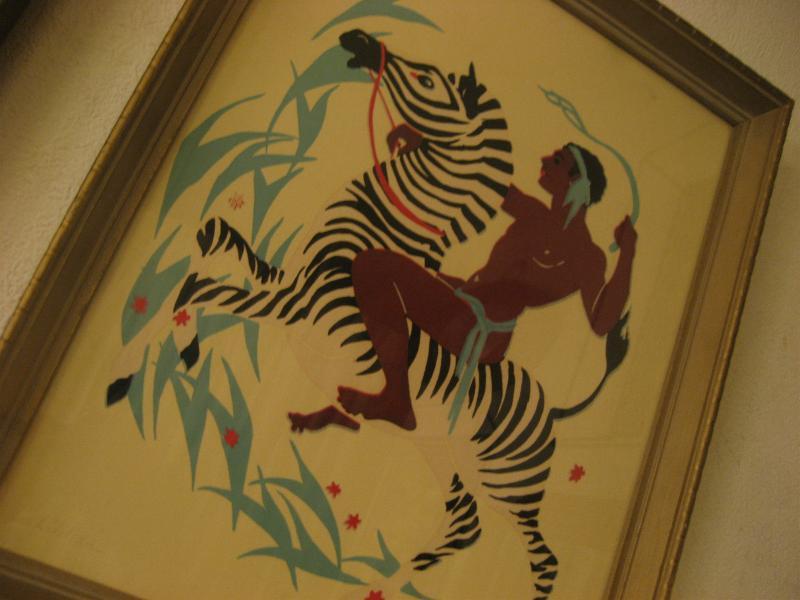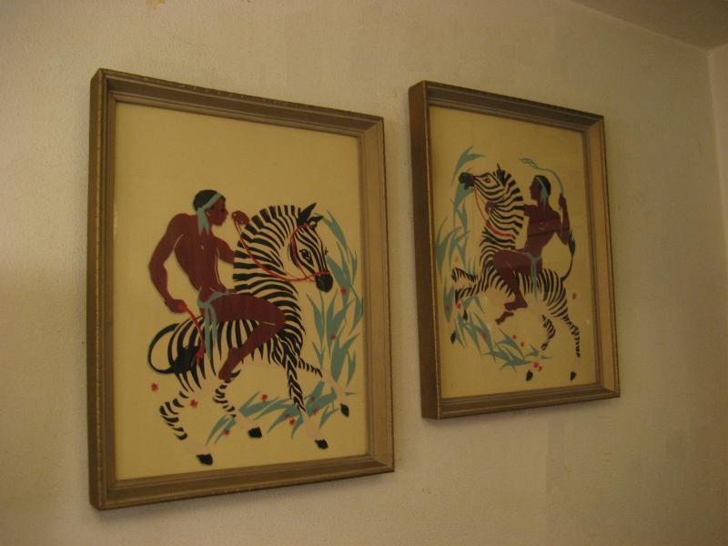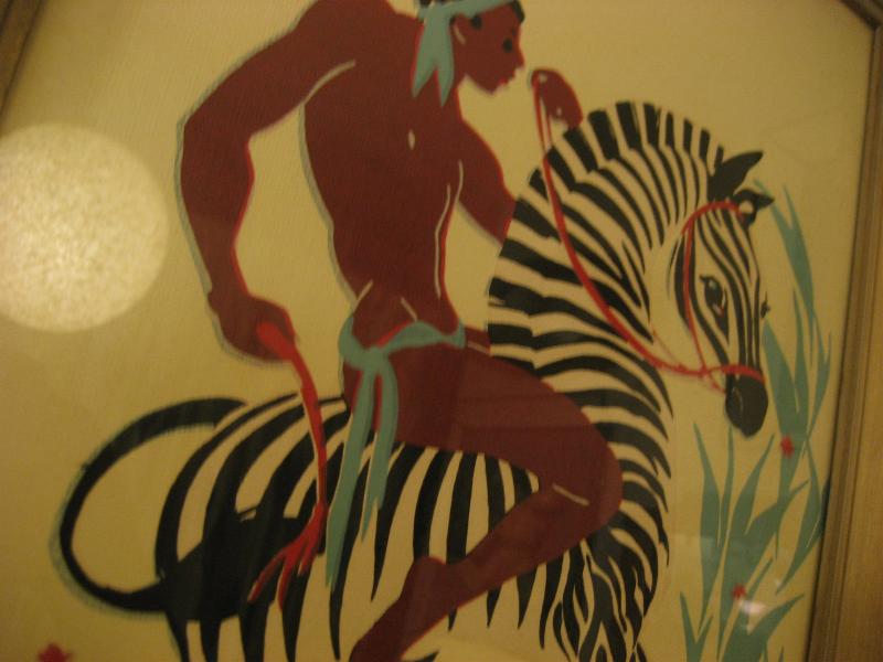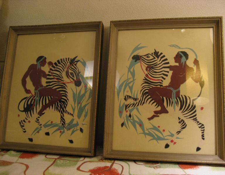 | ペアビンテージウォールデコ / 40-50年代 USA ゼブラにアフリカンのウォーターカラープリントのレアなフレームアートペア! ゼブラにまたがり、戦うウォーリアーズを描いたもので、ターナーと同時代頃の壁掛けセットと思われます。 クールでGOODなビンテージウォールデコレーションピース! |