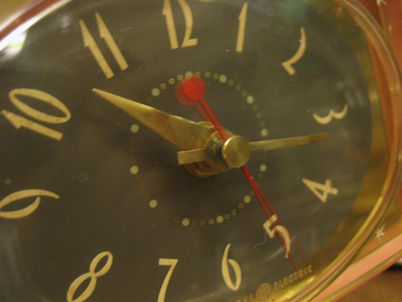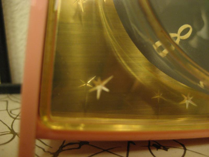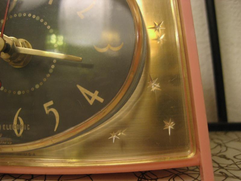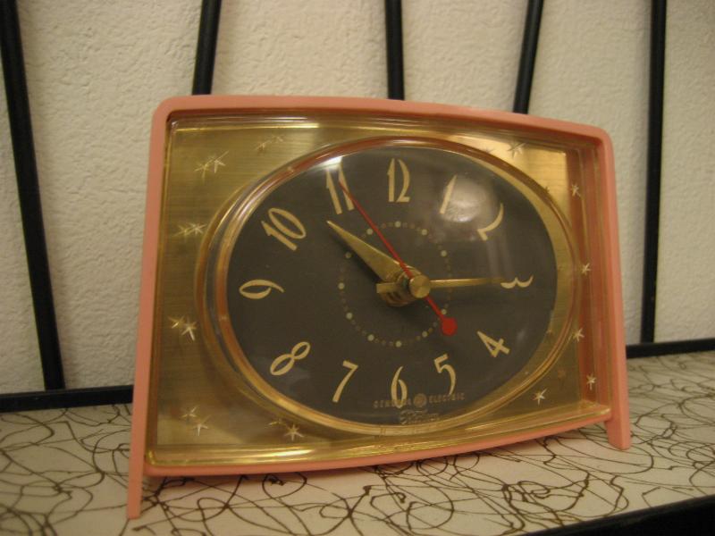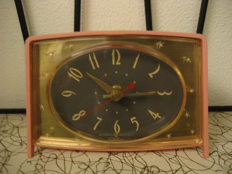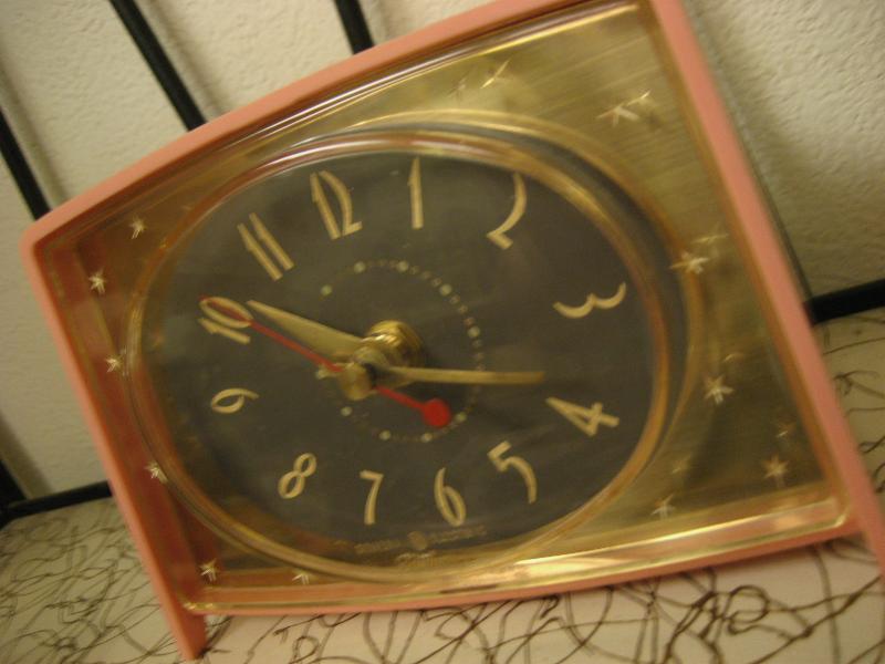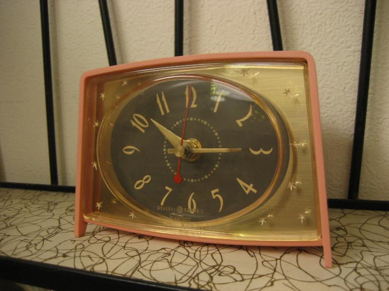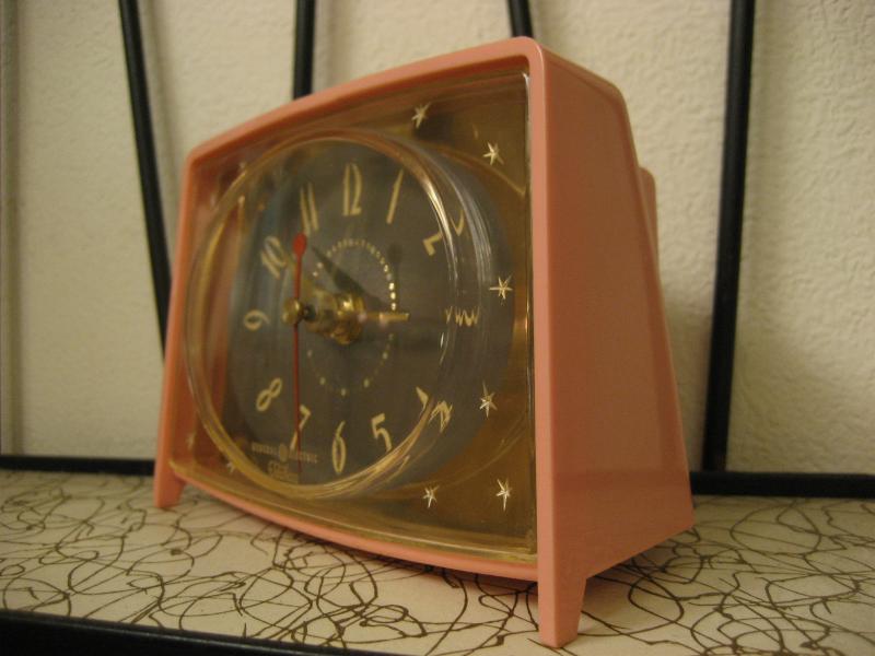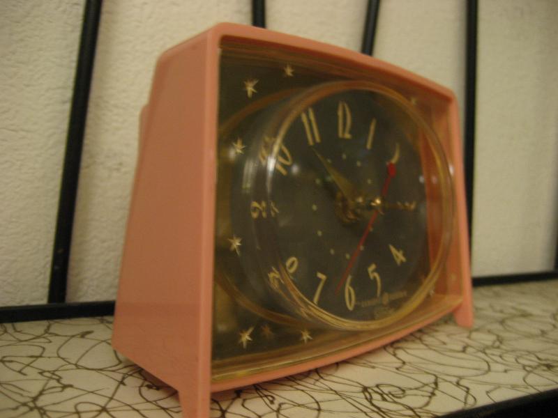 MADE IN USA GEのレアでアトミックシェイプなビンテージ置時計。ピンクボディにブラック文字盤でゴールドインデックス&オリジナルゴールドハンド。文字盤の外パネル部分にスターバーストデコレーション。クールでGOODなビンテージタイムピース! ムーブメントはバッテリータイプ(単3x1個使用)に交換済みですので時間は正確です。 |