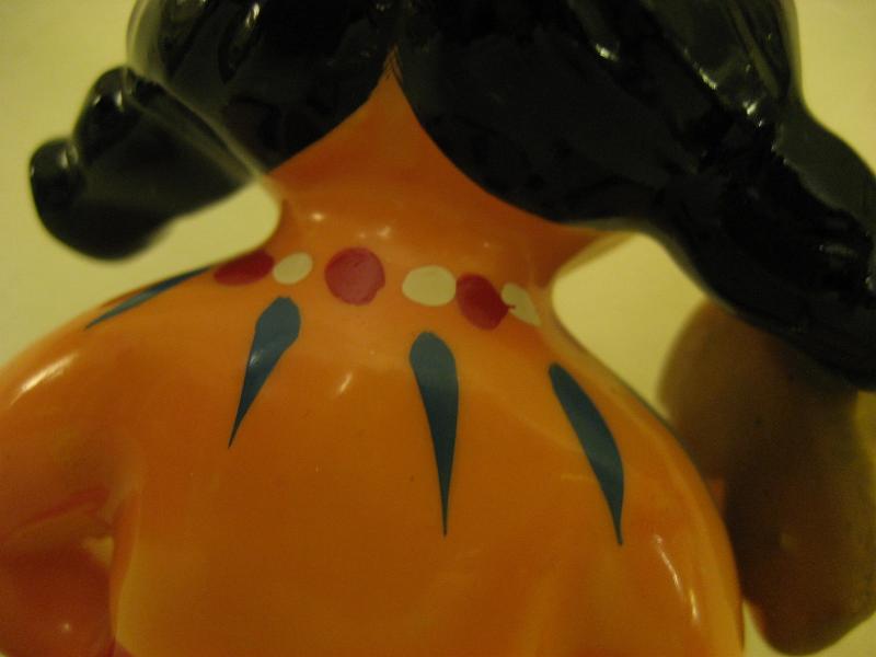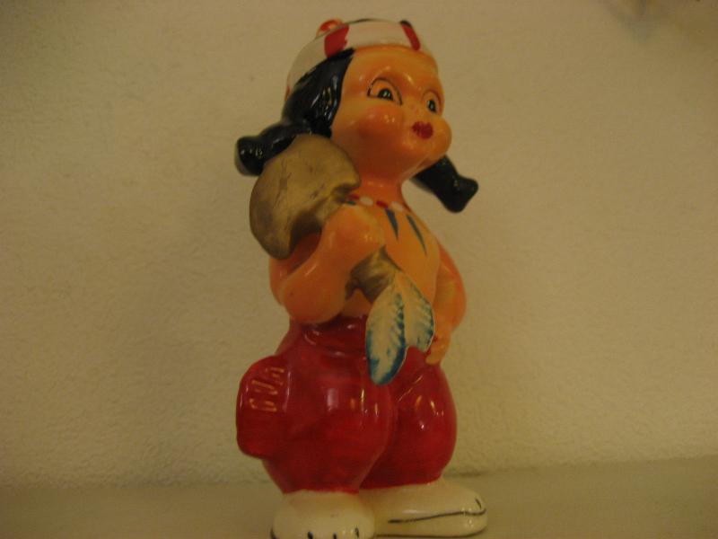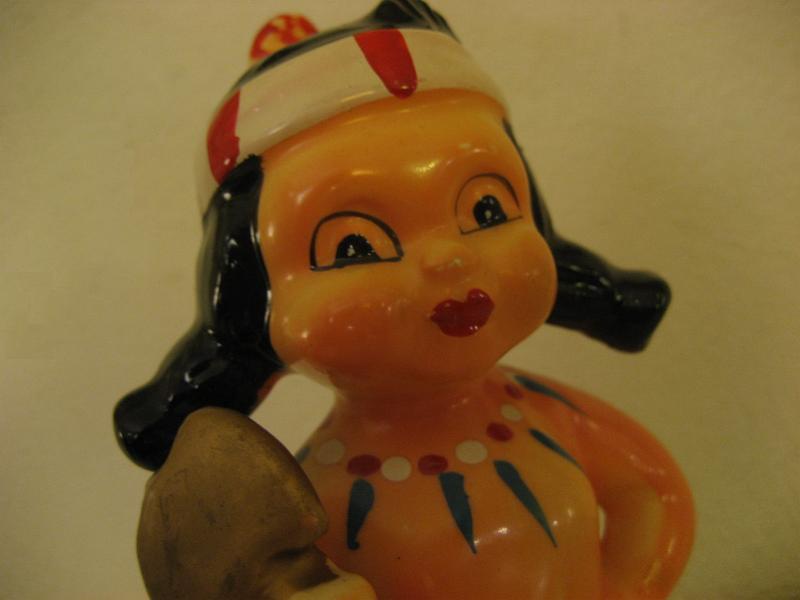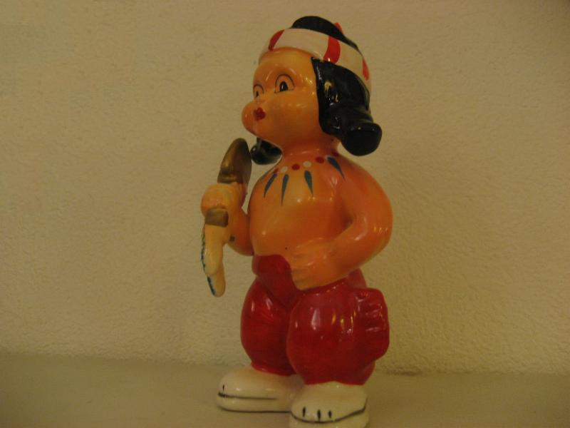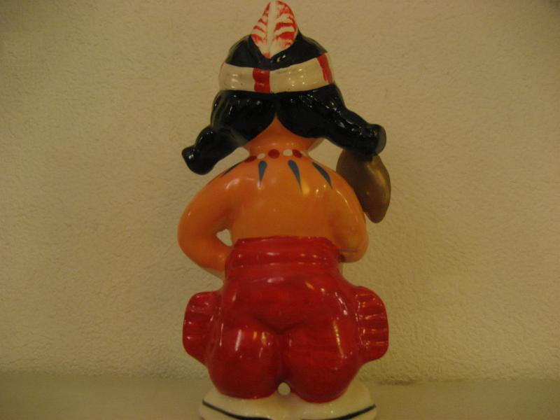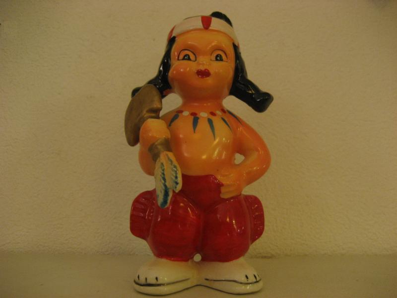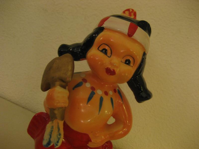 | ビンテージインディアン置物 / 40-50年代 USA. 陶器製のインディアンキッズ置物。手に斧を持っていて、頭に羽飾り、カラフルなネックレスを想像させるネックペイント。ディスプレイにおススメのクールでGOODなビンテージデコレーションピース! |