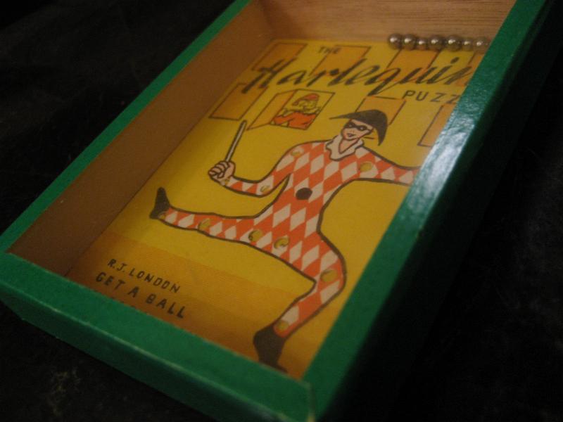 ENGLAND. なかなかレアでハーレクイン絵柄がクールなハンディタイプのボールダウンパズル。絵柄の丸い穴にボールを入れるパズルゲーム。単純だけど結構むずかしい。。。! クールでGOODなビンテージコレクティブルピース! |