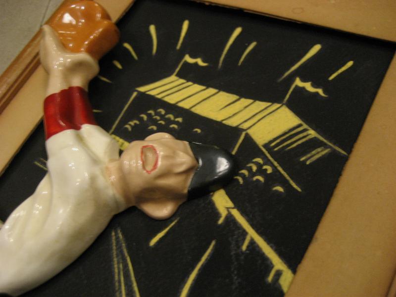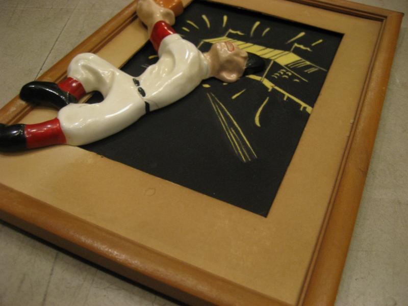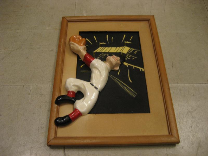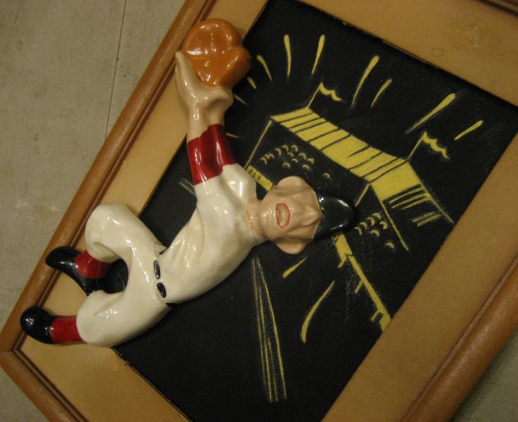 | ビンテージベースボールウォールデコ / 40-50年代 Artcraft Novelty Co. USA ウッドフレームでスタジアムペイントされたブラックボードをバックに陶器製のベースボールプレーヤーがジャンプしている構図のビンテージ壁掛け。クールでGOODなビンテージデコレーションピースです! |