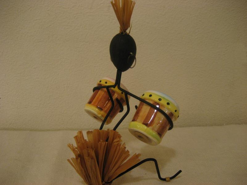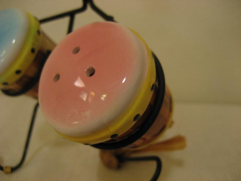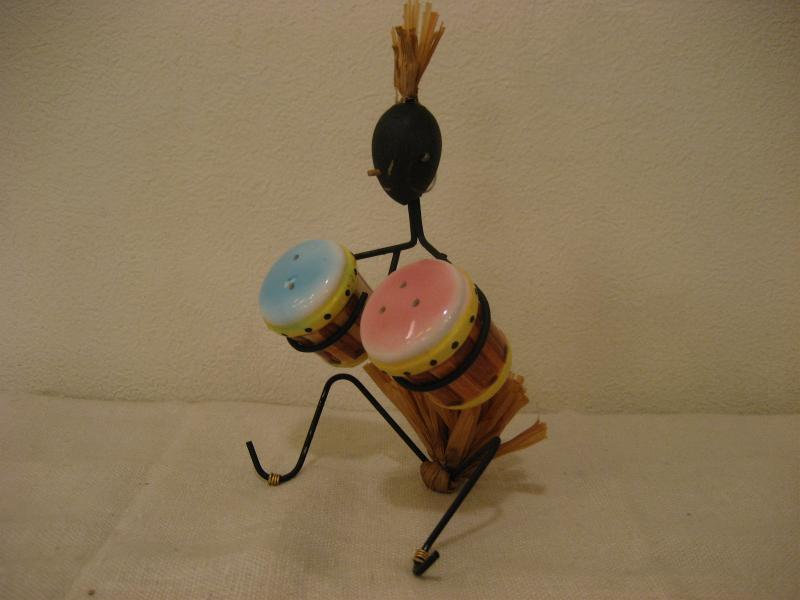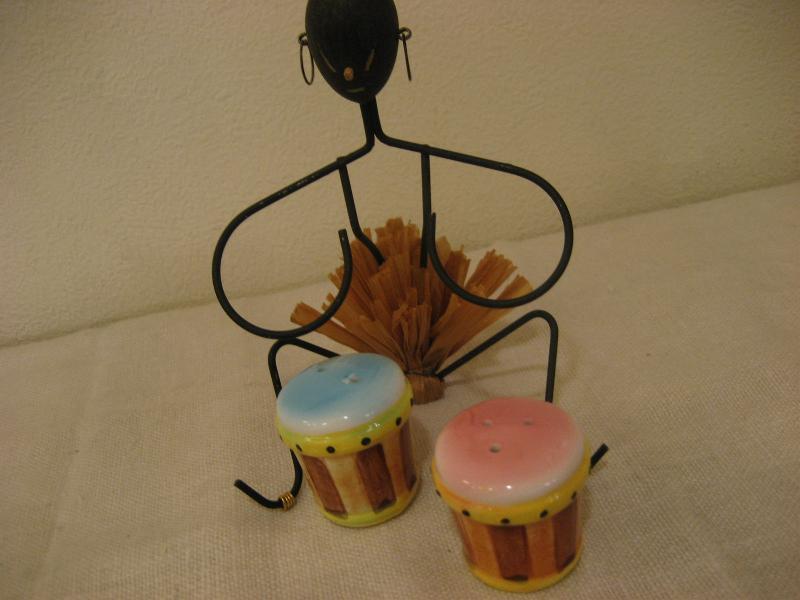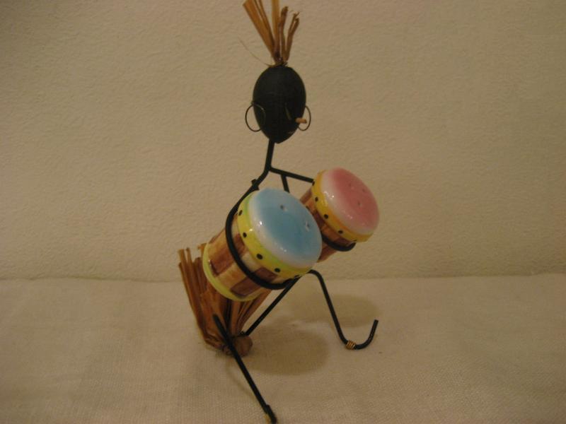 | ビンテージアフリカンソルト&ペッパーシェーカーセット / 40-50年代 USA. ブラックワイヤーフレームでウッドヘッド、トップとウェストに飾り付きで陶器製のシェーカーを抱えたデザイン。耳にイヤリングと足首にもリングデコ。クールでGOODなビンテージデコレーションピース! |