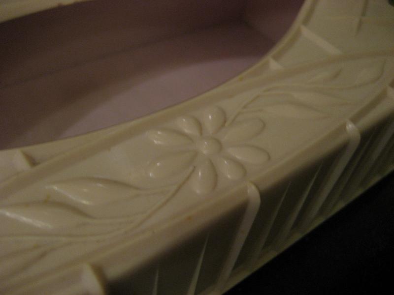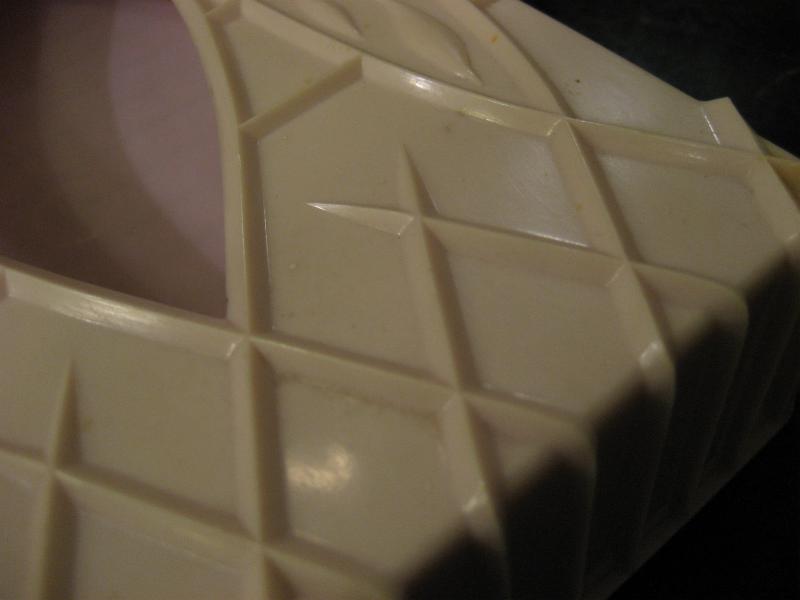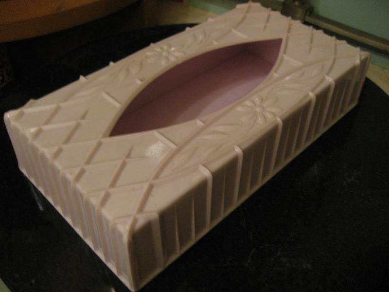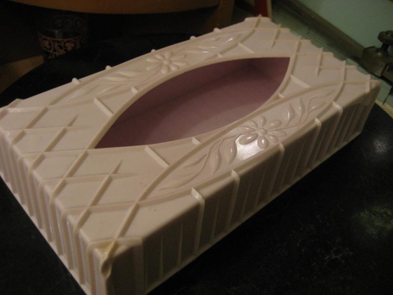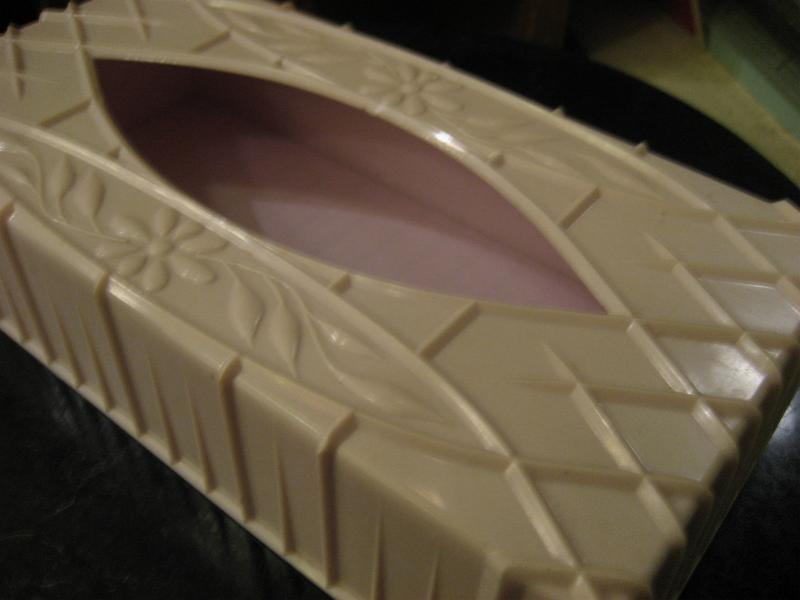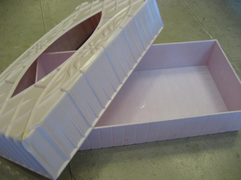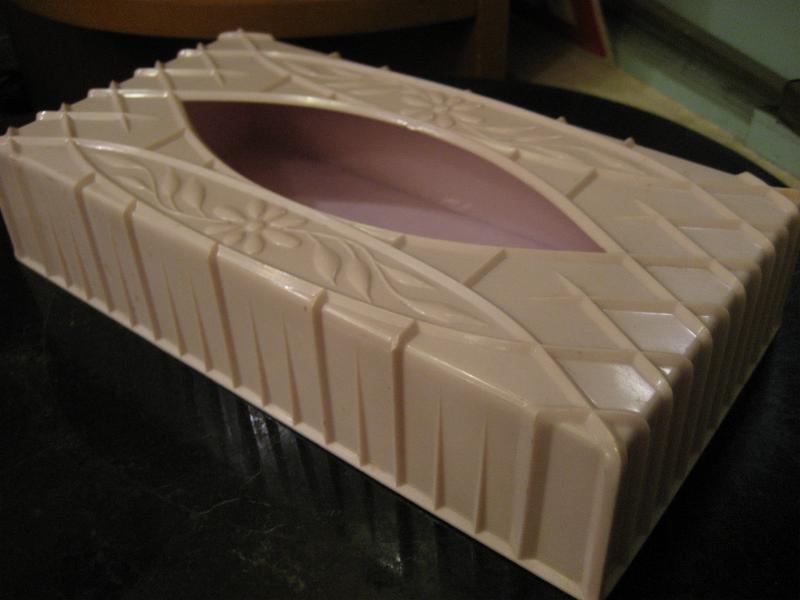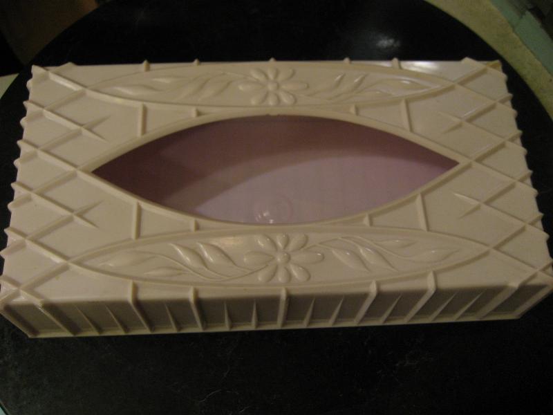 | ビンテージレトロティッシュケース / 50-60年代 USA. 薄いピンクカラーのプラスチックメイドティッシュボックス。アーガイル柄のようなラインとフラワー絵柄の地柄デザイン。クールでGOODなビンテージバニティピース! |