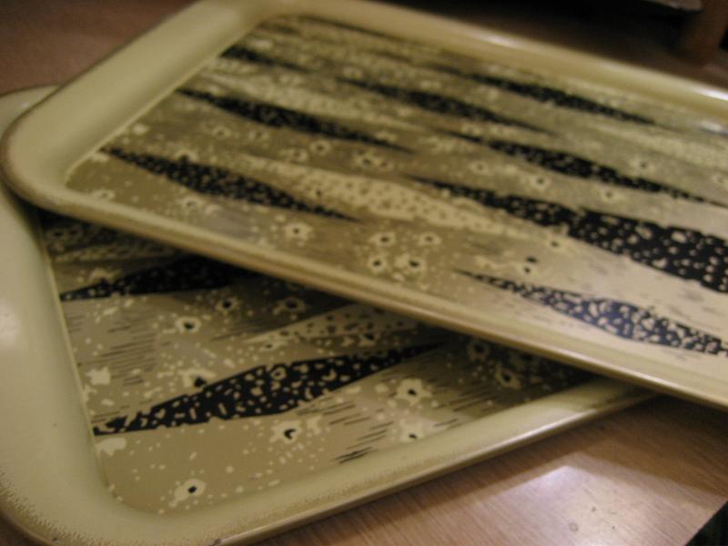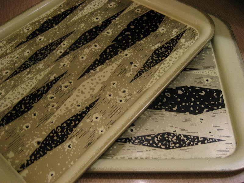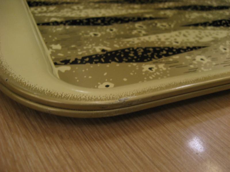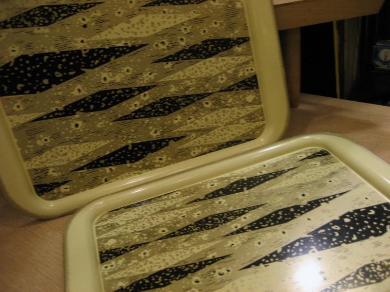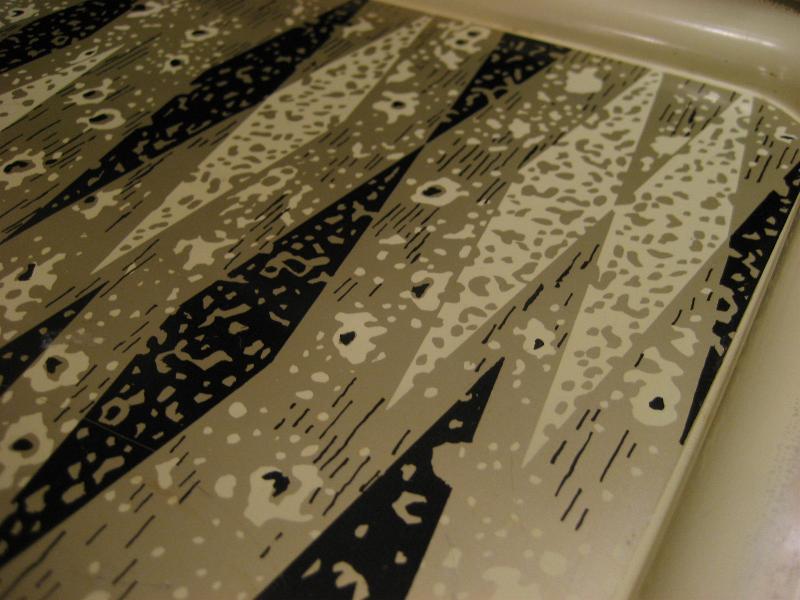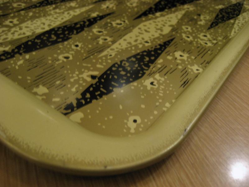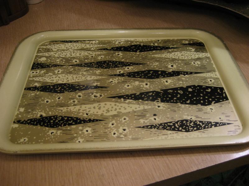 | ビンテージメタルトレー / 50-60年代 USA メタルメイドのハーレクインアーガイル柄がクールなビンテージトレイ。アイボリーベースにブラックとゴールドのアトミック柄。ディスプレイやブレックファストまたは、ランチ用トレイなどにもおススメです。。。 クールでGOODなビンテージピース! |