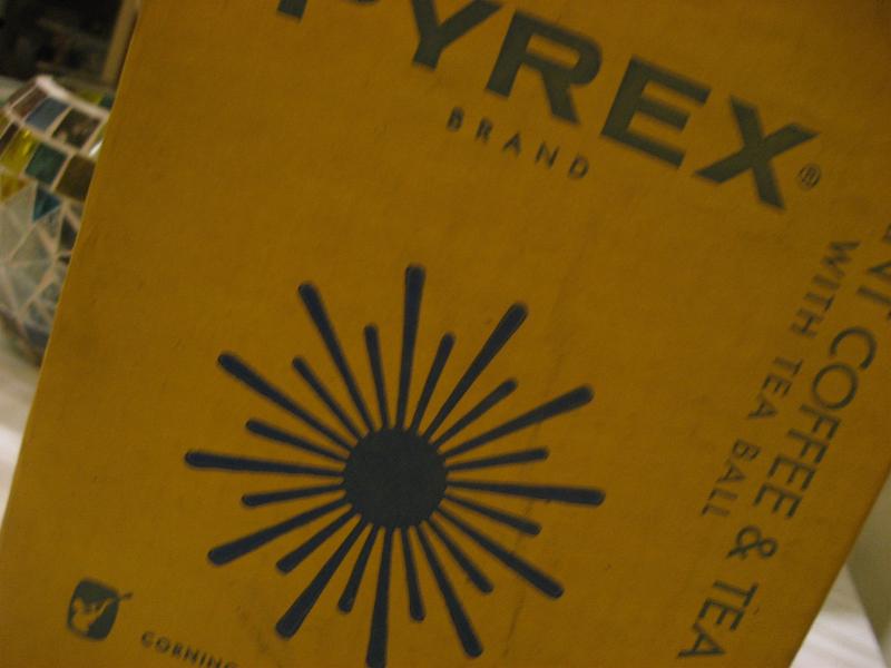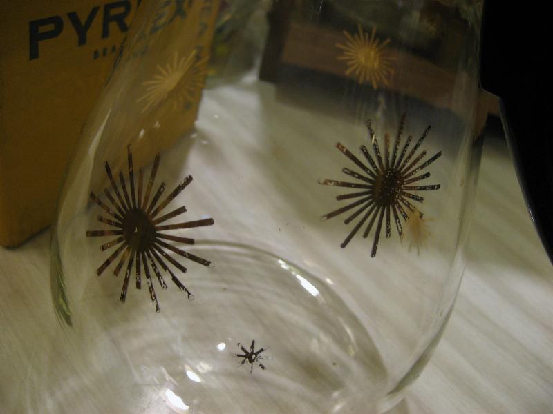 USED クールなスターバーストプリントのビンテージパイレックスガラスポット。トップのフタは取り外し可。インスタントコーヒー&紅茶メーカーと外箱に書かれていますが、もちろんお水やジュースなどのピッチャーなどにもおススメです! クールでGOODなビンテージテーブルピース! |