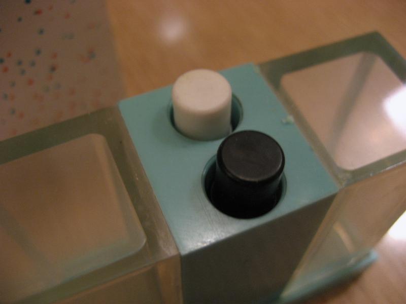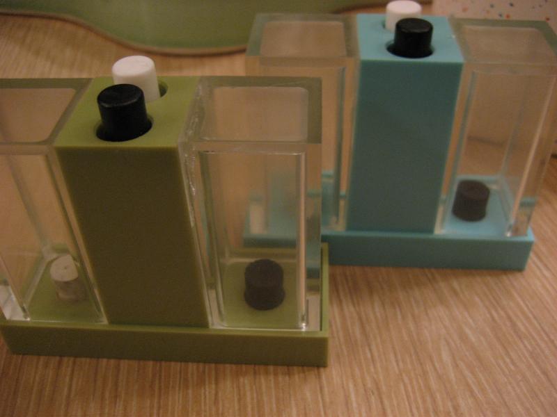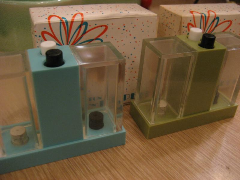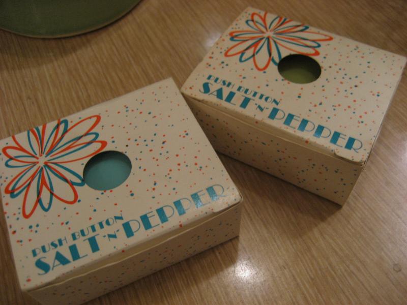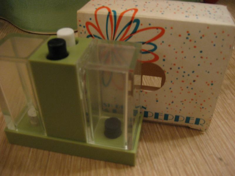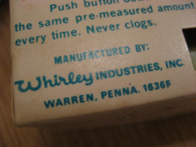 MADE IN USA. デッドストック オリジナルボックス入り。プッシュボタンタイプのソルト&ペッパーシェーカー。カラーは2タイプ。トップのボタンを押すと底面のフタが開いて粒子が出る仕組み。クールでGOODなビンテージコレクティブルピース! ■Whirley Industries, Inc■ 1960年創業のPennsylvania州、Warrenのプラスチック加工メーカー |
