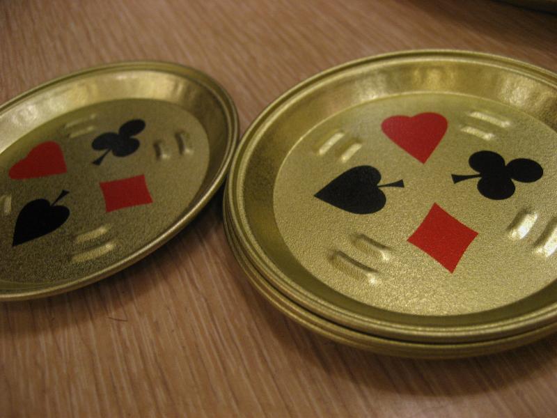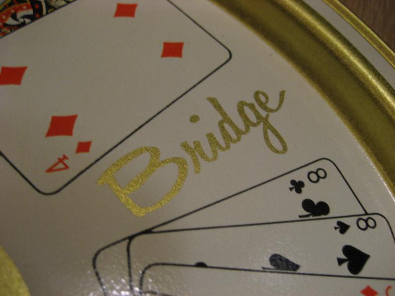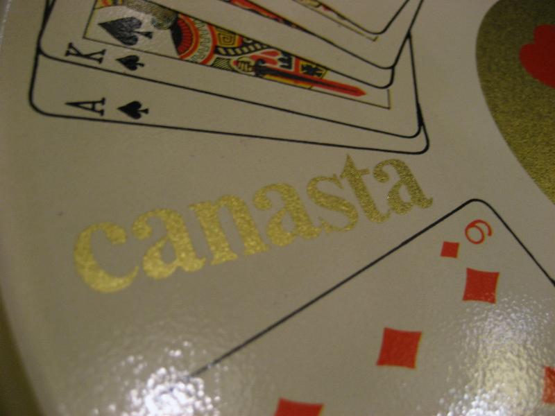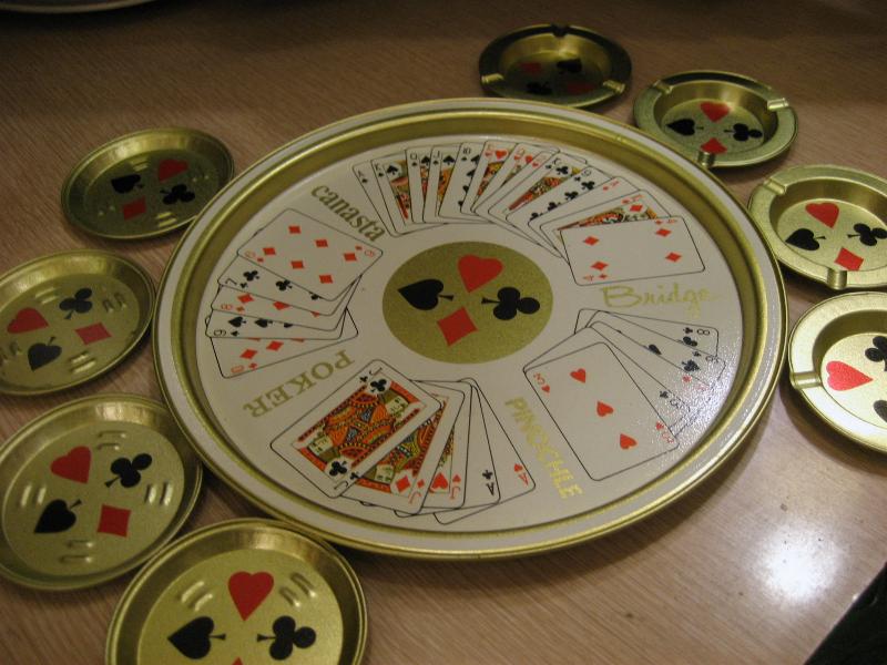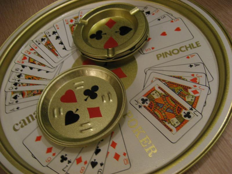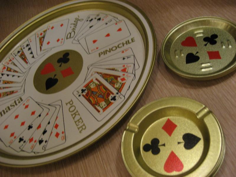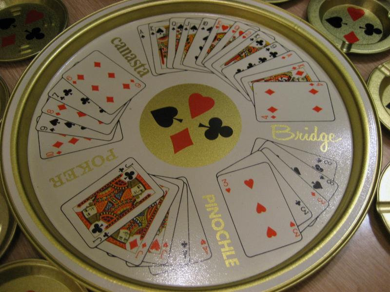| ビンテージトランプメタルトレーセット / 50-60年代 USA デッドストック トランプゲーム名と絵柄がプリントされたトレーにトランプマークプリントのドリンクコースターとアッシュトレイがそれぞれ4枚のテーブルセット。クールでGOODなビンテージテーブルピース! |