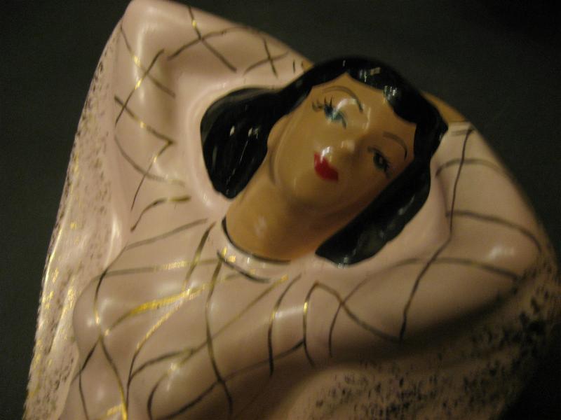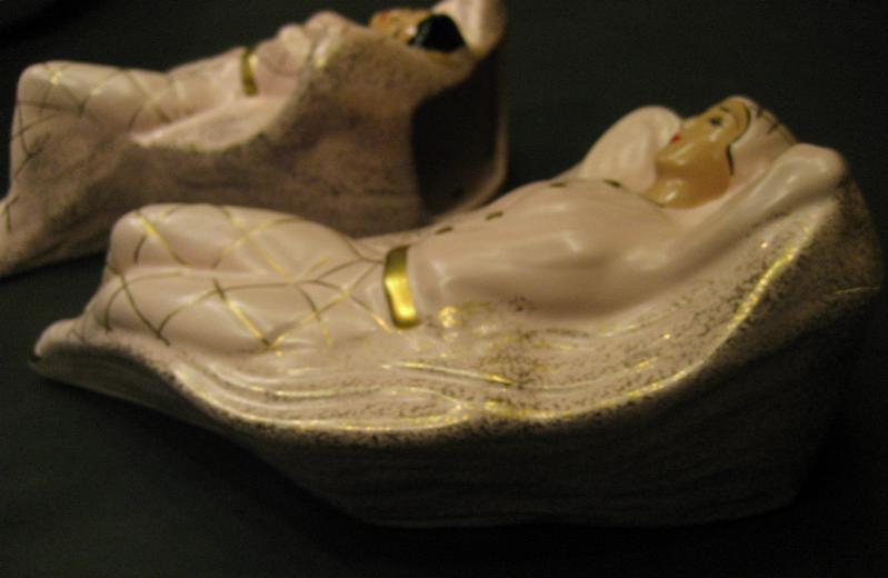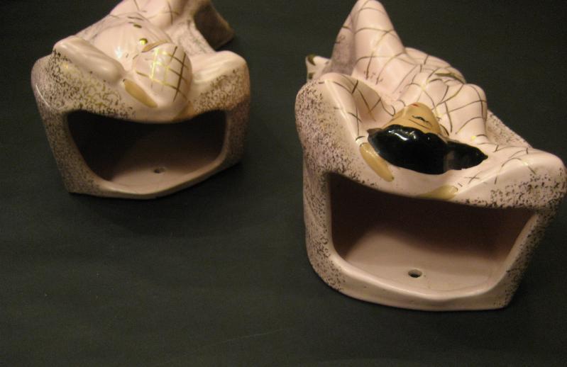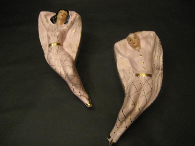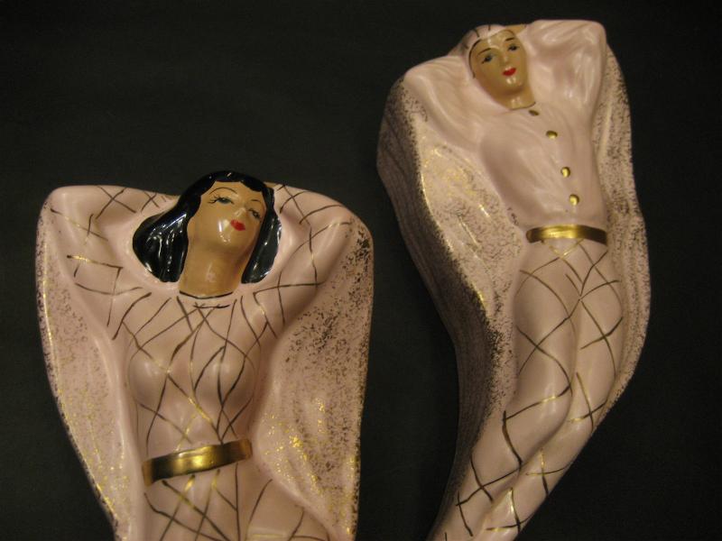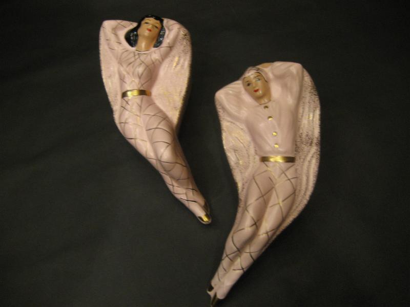| ペアビンテージハーレクインダンサーウォールデコ / 40-50年代 "California Originals" USA. 陶器製のペアハーレクイン壁掛けで後ろ側はプランターになってます。カラーはピンクベースにゴールドアクセント。クールでGOODなビンテージウォールデコレーションピース! |