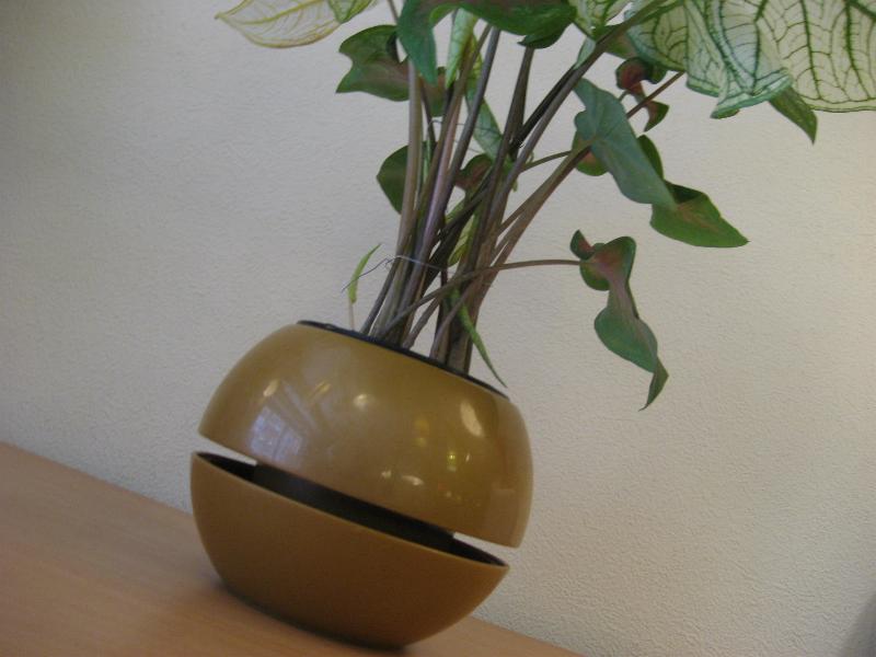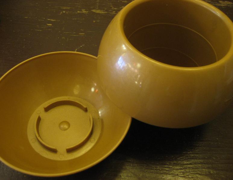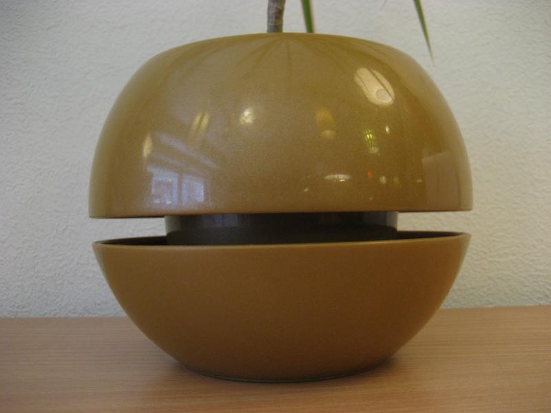 MADE IN USA レアなラウンドボールシェイプのスペーシーフォルムがクールなアトミックプランターポット。ダークゴールドカラーのプラスチックメイドで、上下が分割されて下側のトレイに溜まったお水もクリーンアップOK。。。 テーブルやシェルフのディスプレイにおススメのクールでGOODなビンテージデコレーションピース! |