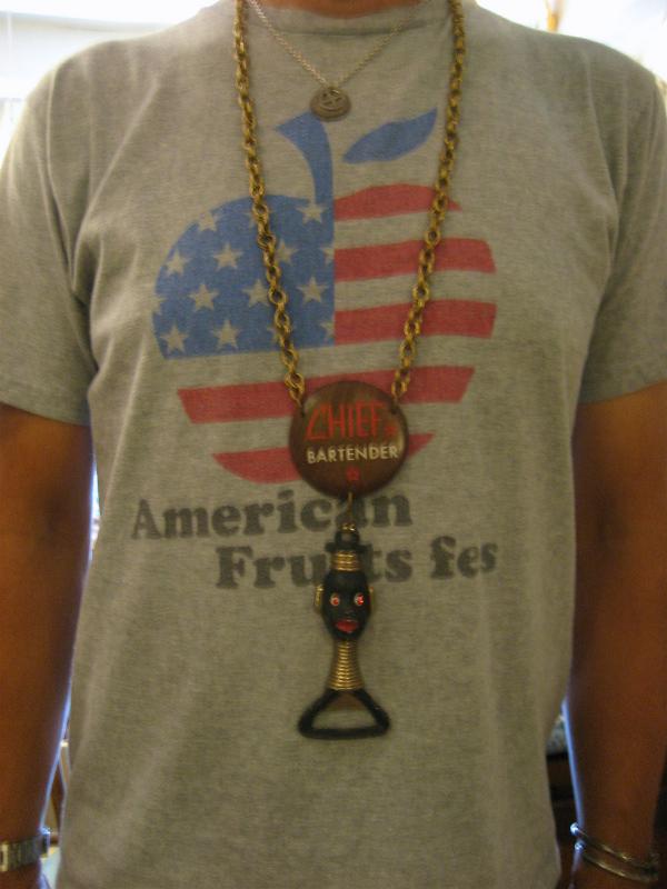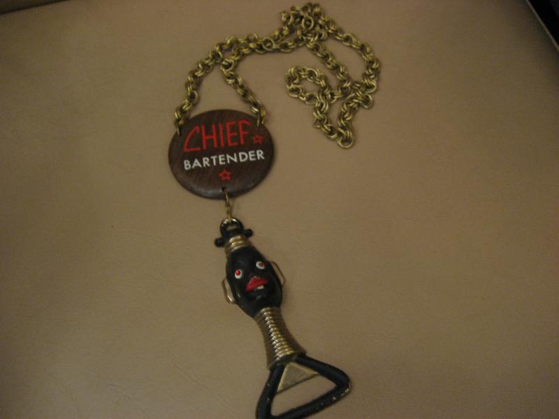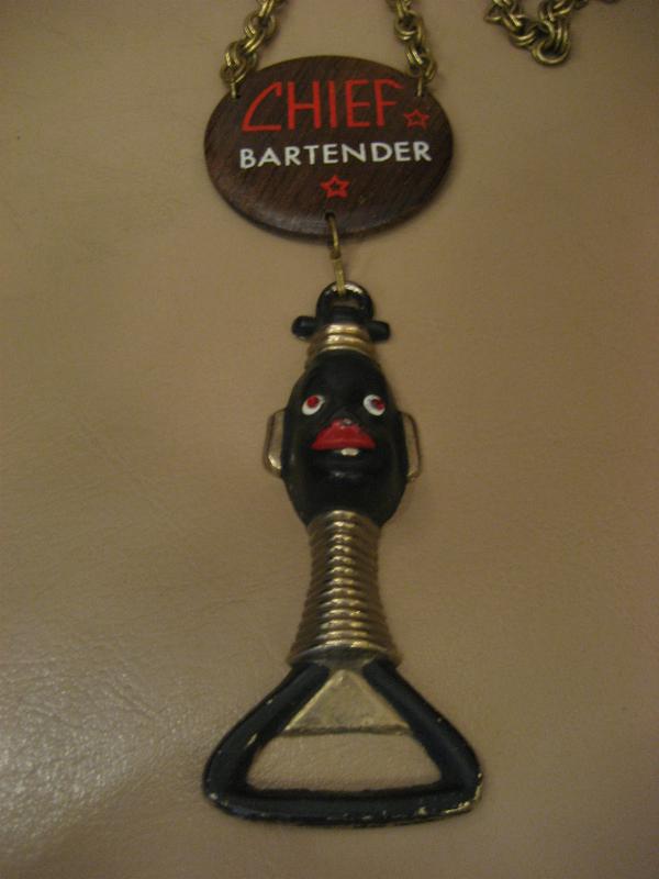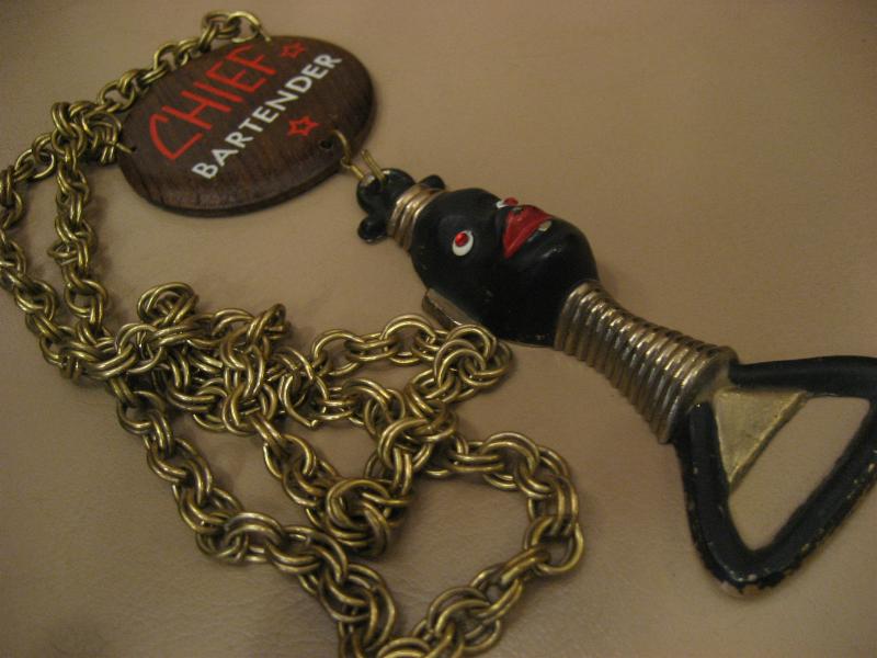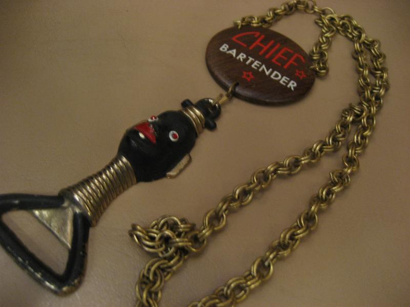 | ビンテージアフリカンボトルオープナー / 50-60年代 USA ネックハンギングのバーテンダーボトルオープナー(栓抜き)。ウッドパネルに"CHIEF BARTENDER"と書かれています。チェーン部分はブラスメイドでダブルリングチェーンタイプ。栓抜き本体はキャストメタルでアフリカンバストUPデザイン&ペイント。ディスプレイにもおススメです! クールでGOODなビンテージBARウェアコレクティブルピース! |