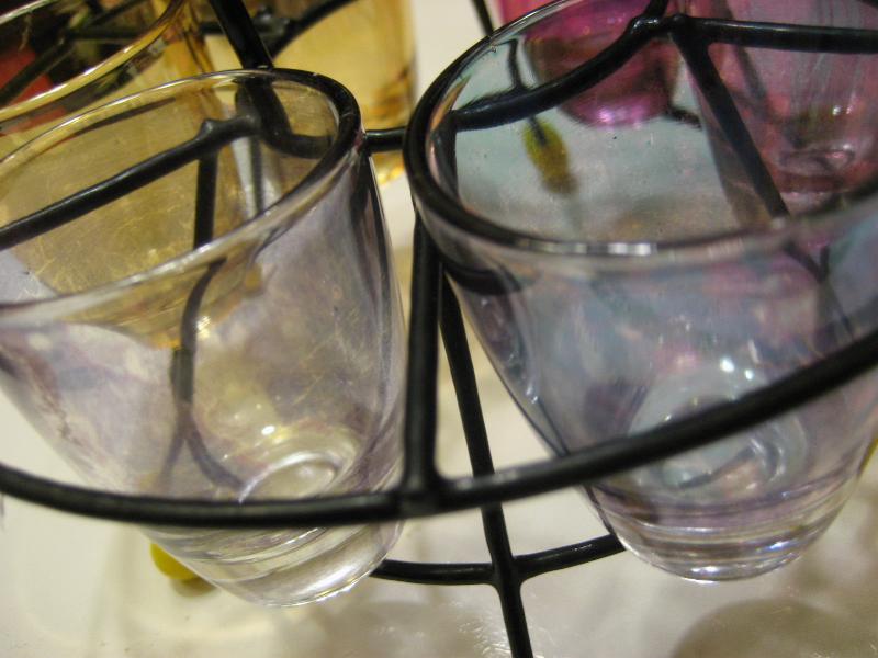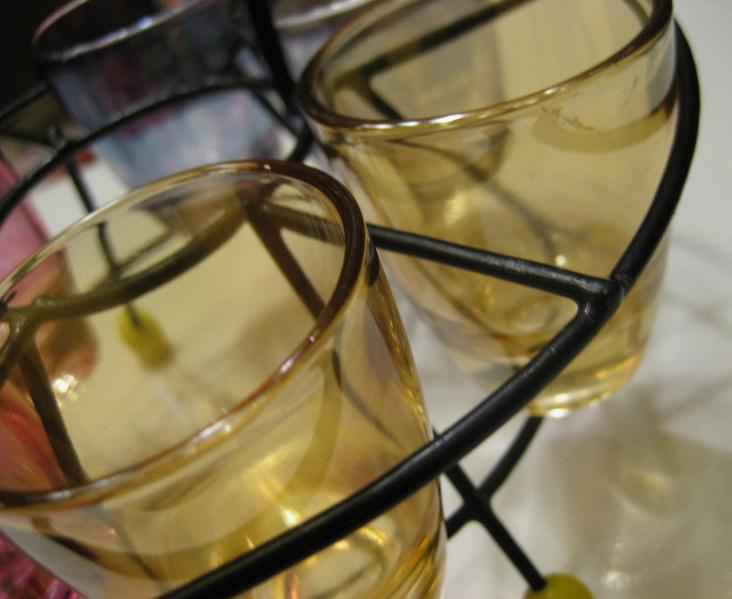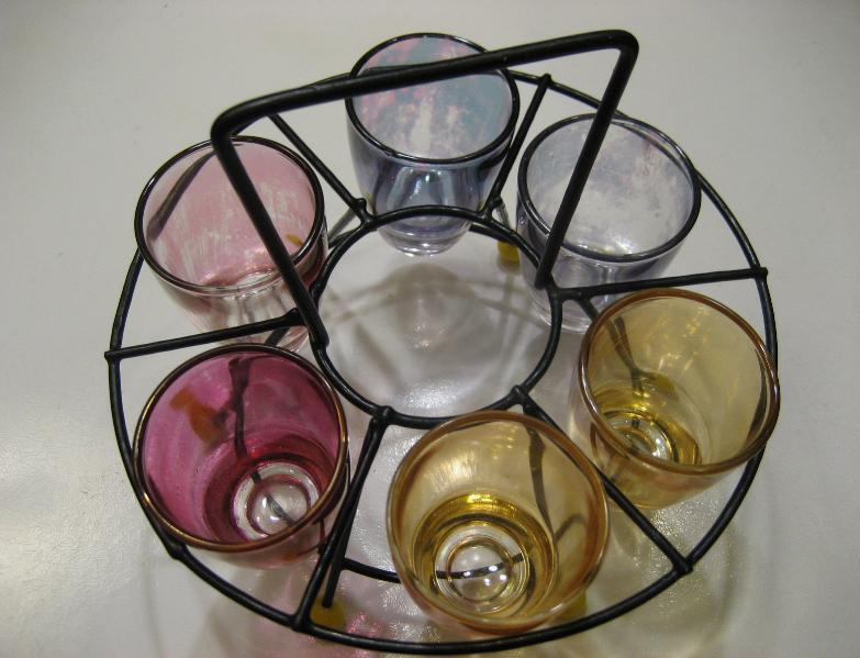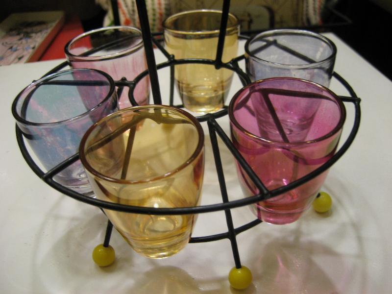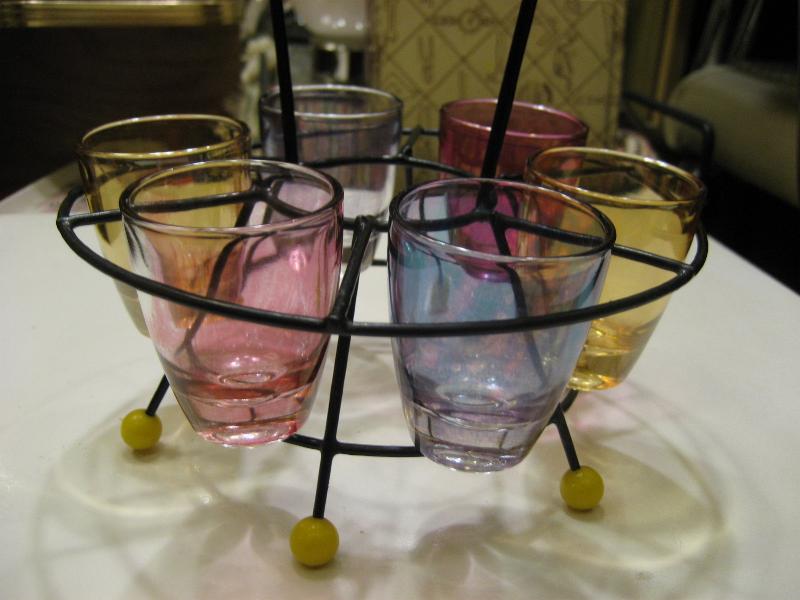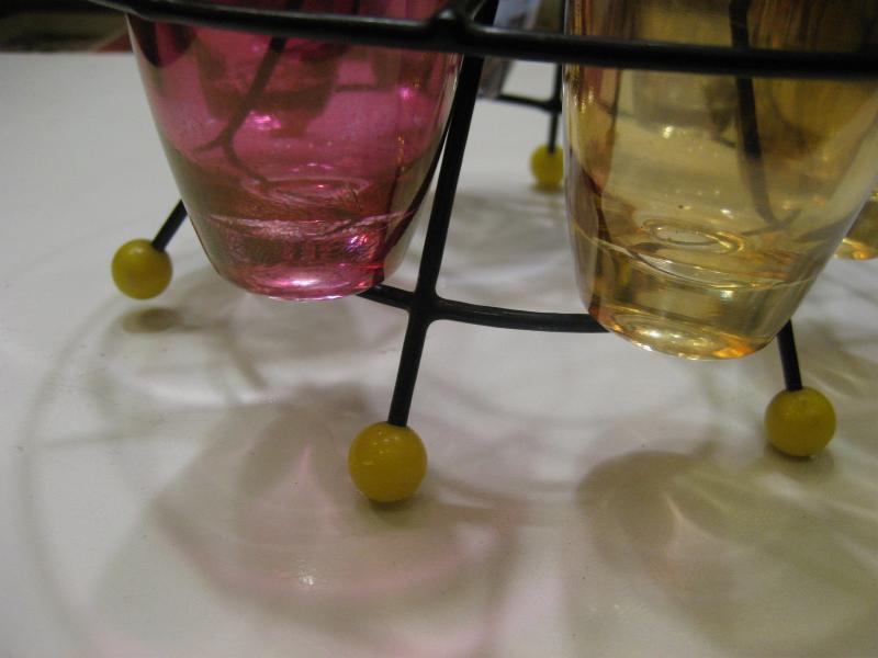 | ビンテージショットグラスセット / 50年代 USA カラーガラスのショットグラスとマッチングワイヤーラックセット。ラックはスペースシップシェイプでブラックワイヤーにイエローボールレッグアクセント。クールでGOODなビンテージコレクティブルピース! |