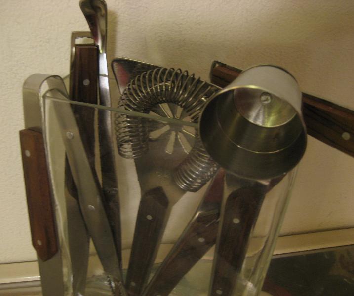 | ビンテージBARウェアセット / 60-70年代 USA. ウッドハンドルのモダンなBARツールセット。内容はスプーン ・ バーナイフ ・ ジガー(計量カップ) ・ ボトル&カンオープナー ・ ストレーナー(こし器) ・ コルクスクリュー ・ トング の7pcコンプリートセット。各ツールのステンレス部分は"JAPAN"メイド。クールでGOODなビンテージコレクティブルピース! ※写真のガラスポットは含みません(ツールのみです) |
