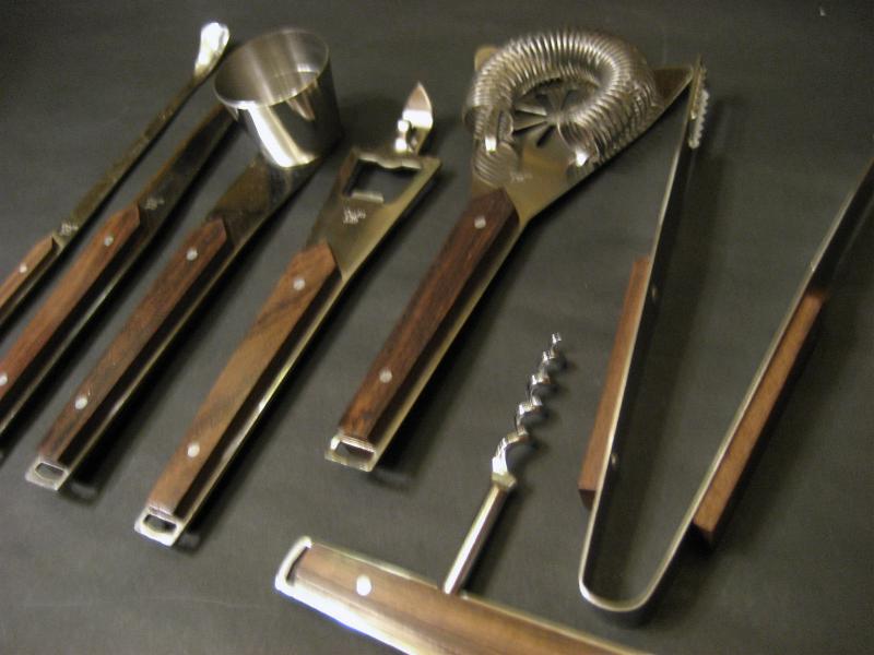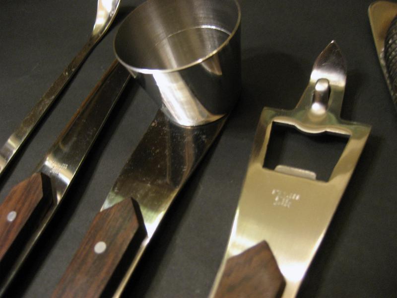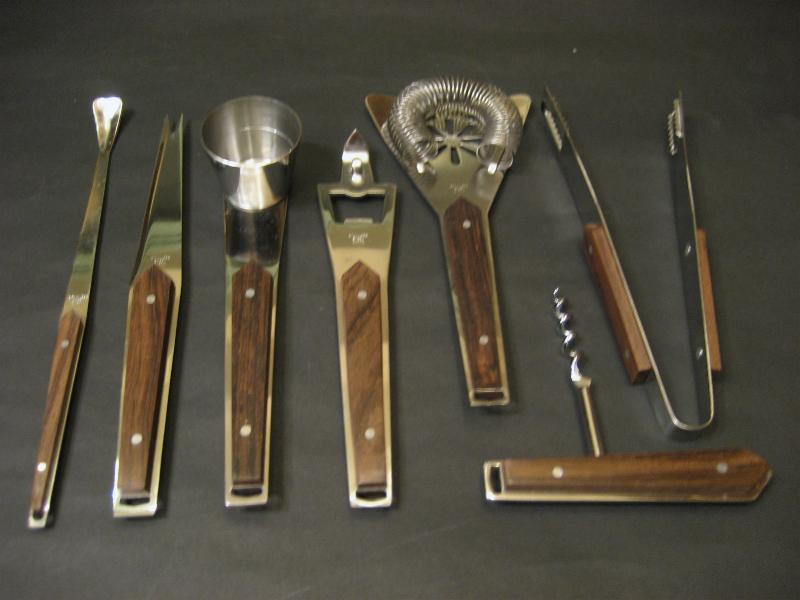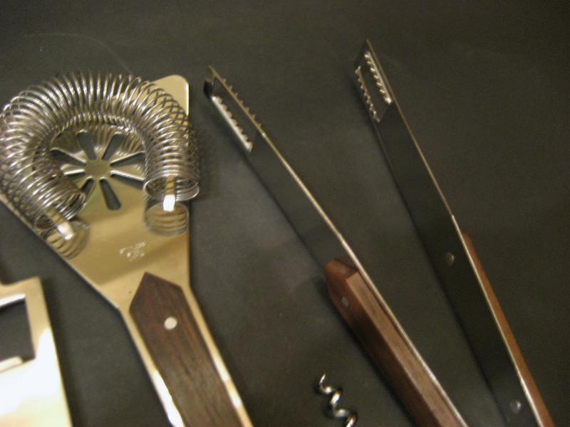 | ↑左から スプーン ・ バーナイフ ・ ジガー ・ ボトル&カンオープナー ・ ストレーナー ・ コルクスクリュー ・ トング | ||