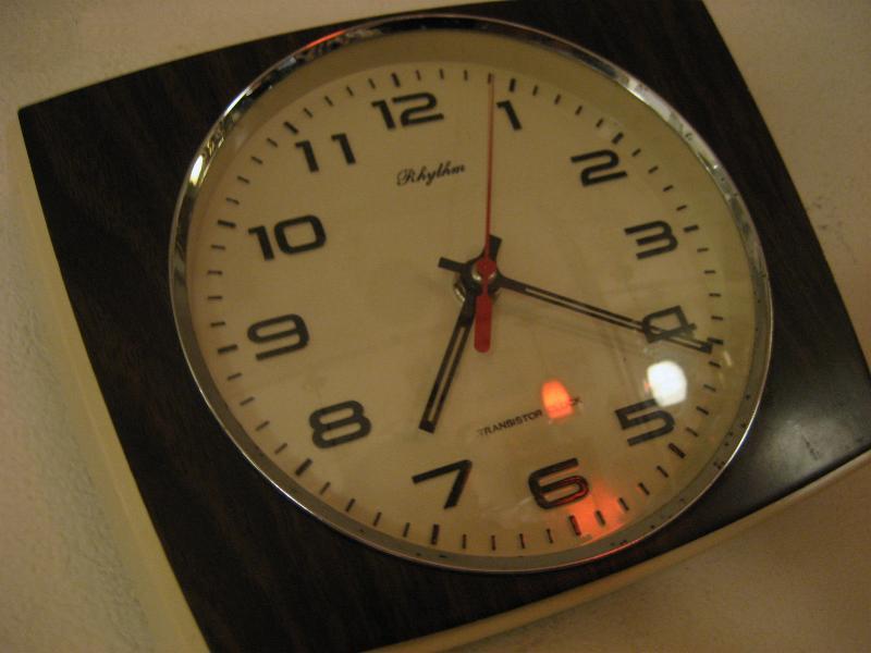 | ビンテージウォールクロック / 70年代 USA. Rhythm, MADE IN JAPAN アイボリーベースにウッド調パネルの壁掛け時計。ブラックハンドで秒針のみレッドカラーアクセント。クールでGOODなビンテージタイムピース! ムーブメント(JAPAN MADE)はオリジナルバッテリータイプ(単2x1個使用)ですので時間は正確です。 |