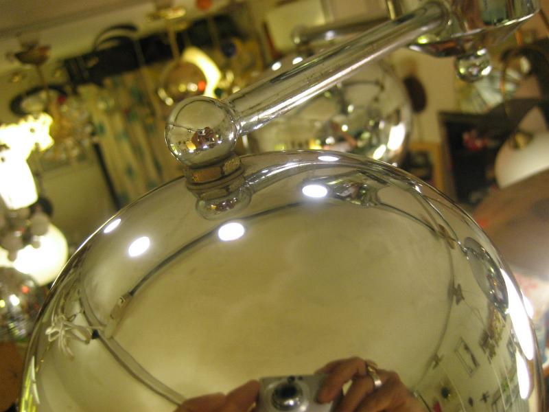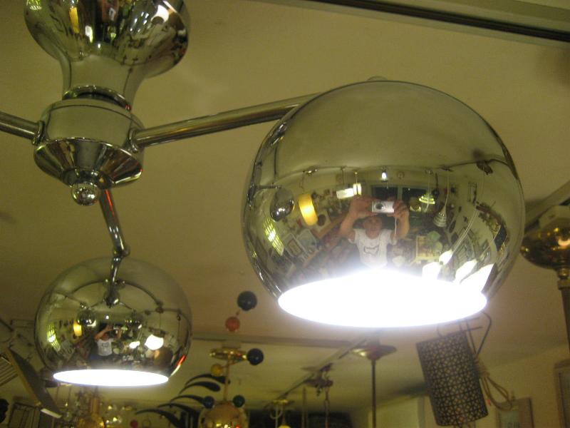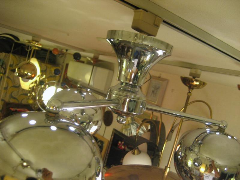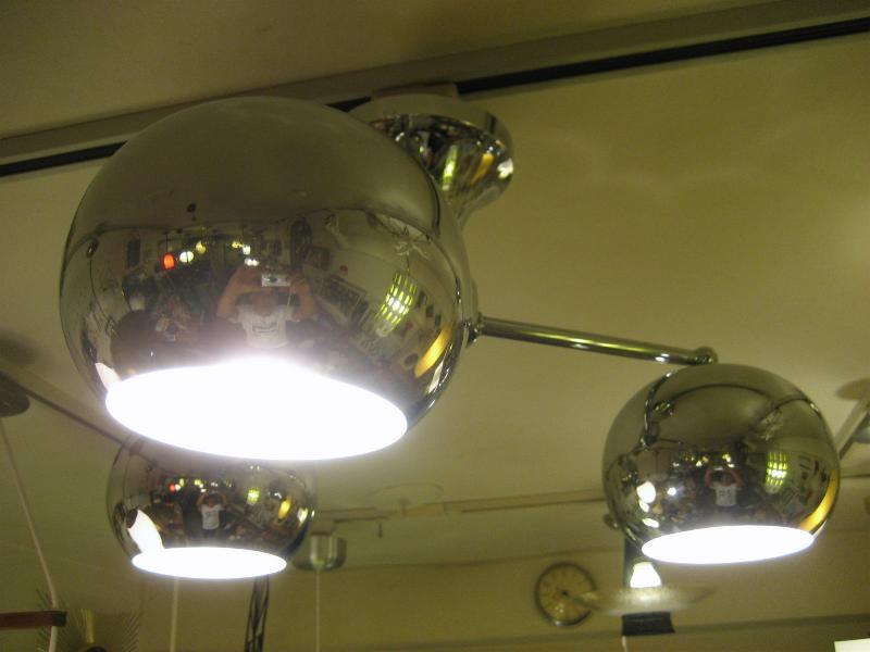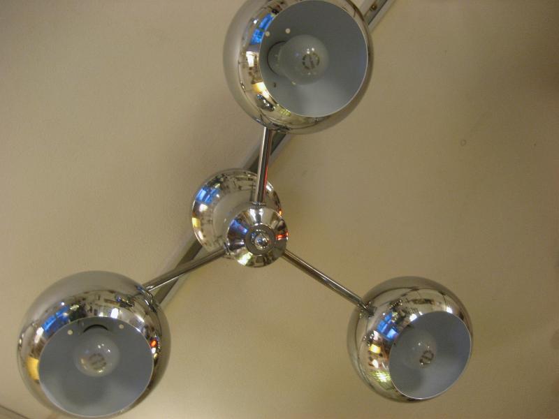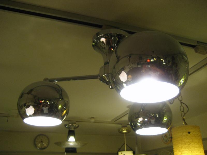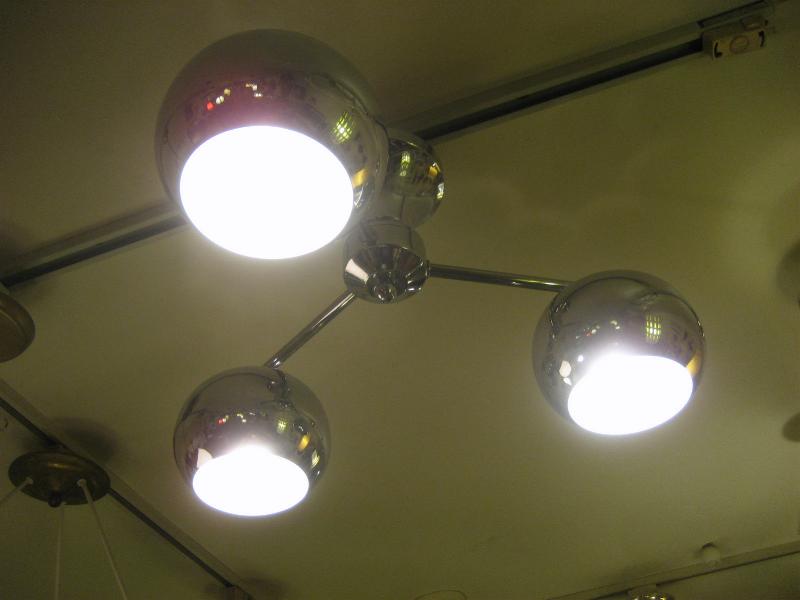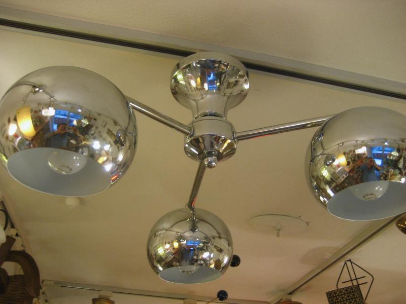 | ビンテージアトミックランプ / 60-70年代 USA スペースシップデザインのアトミックシーリングランプ。センターベースから3本出たアームの先端にそれぞれラウンドボールシェイプのシェードが付いている3スポットフォルム。クールでGOODなアトミックライティングピース、お部屋の雰囲気一発で変わります! 電源は家庭用引っ掛けシーリングに交換済ですのでかんたん設置、すぐに使用できます。 |