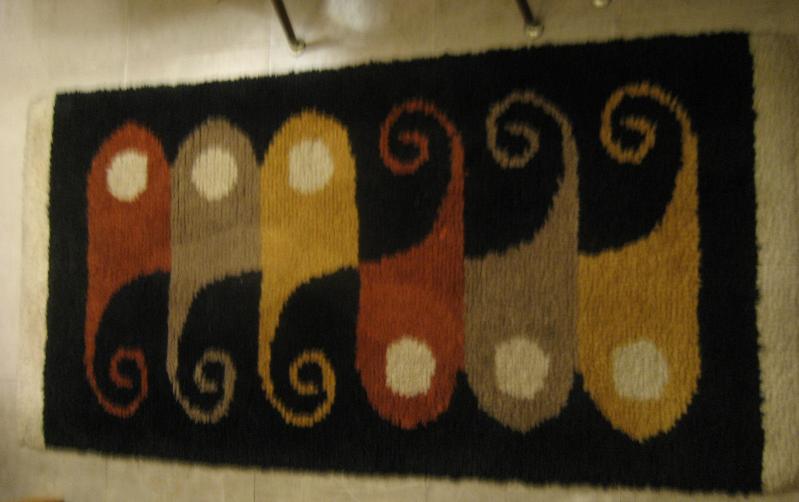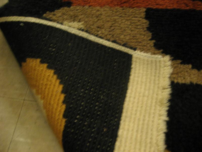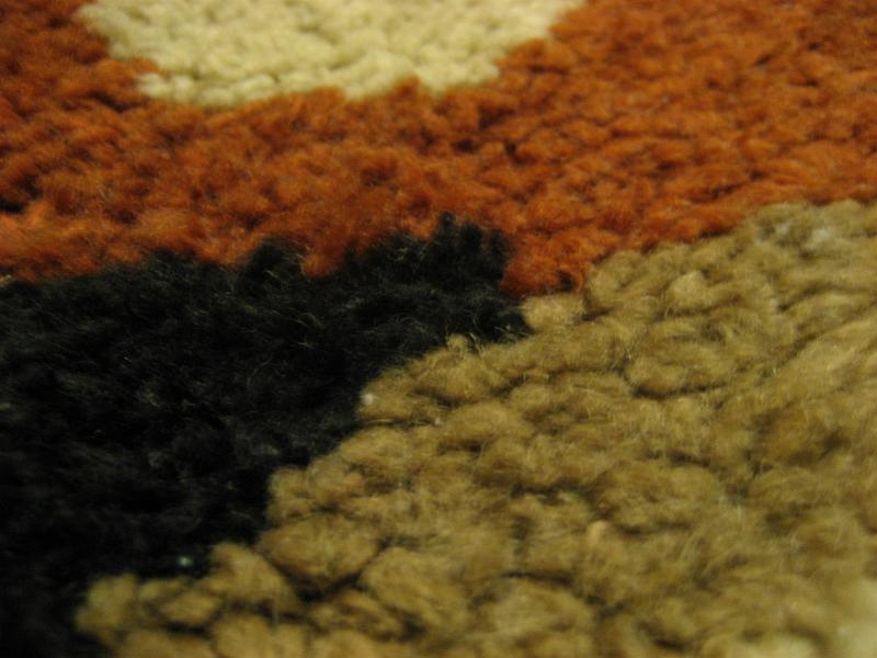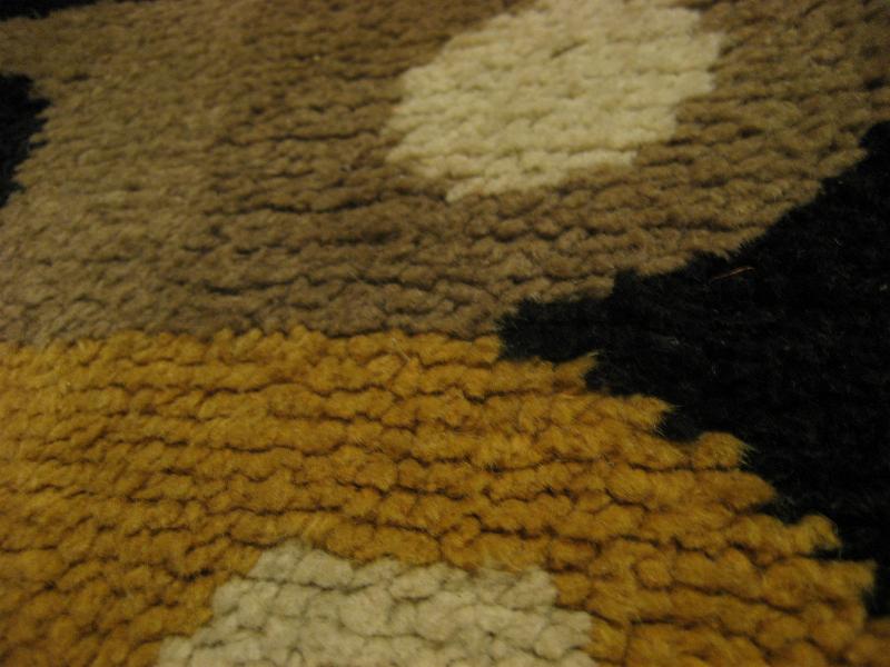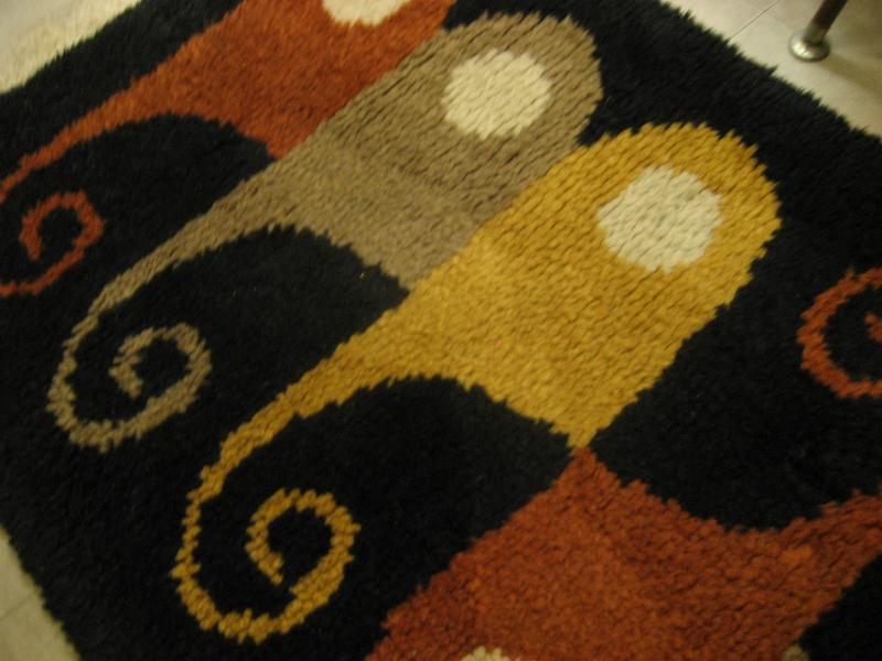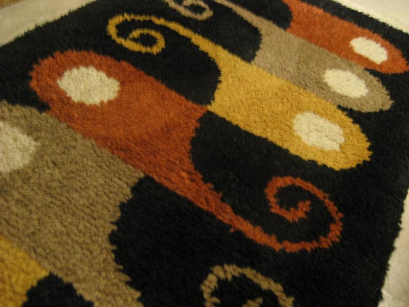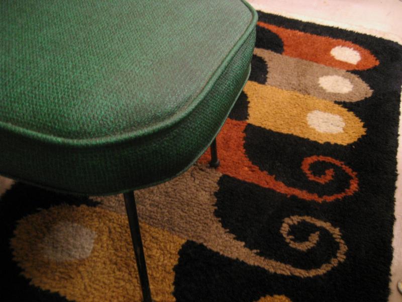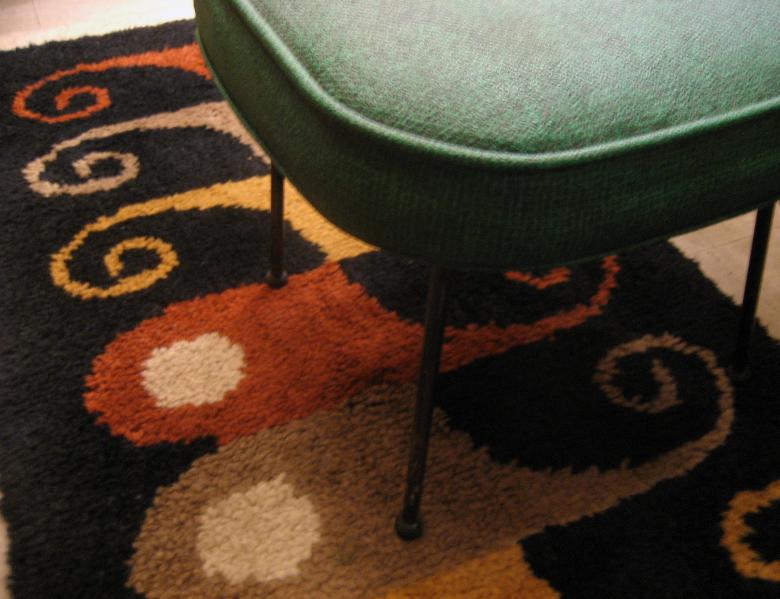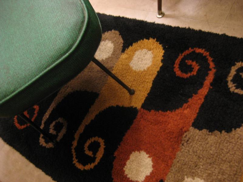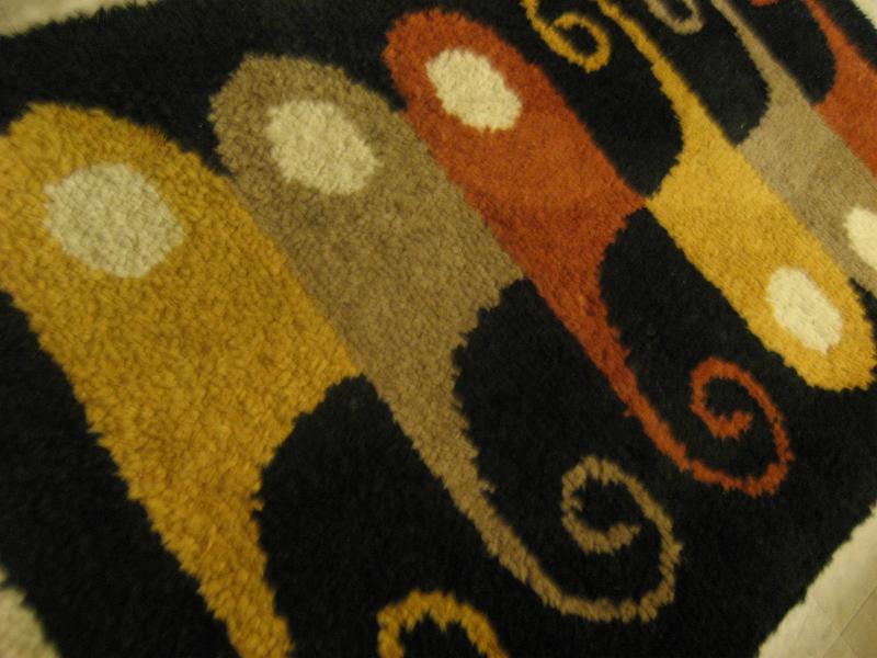 | ビンテージアトミックフロアラグ / 50-60年代 USA. アトミックでモダンな絵柄デザインのミッドセンチュリーフロアラグ。カラーはレアなブラックベースに、ダークイエロー・ダークオレンジ・ベージュ・オフホワイト。リビング等のフロアにモダンでGOODなビンテージフロアピース! |